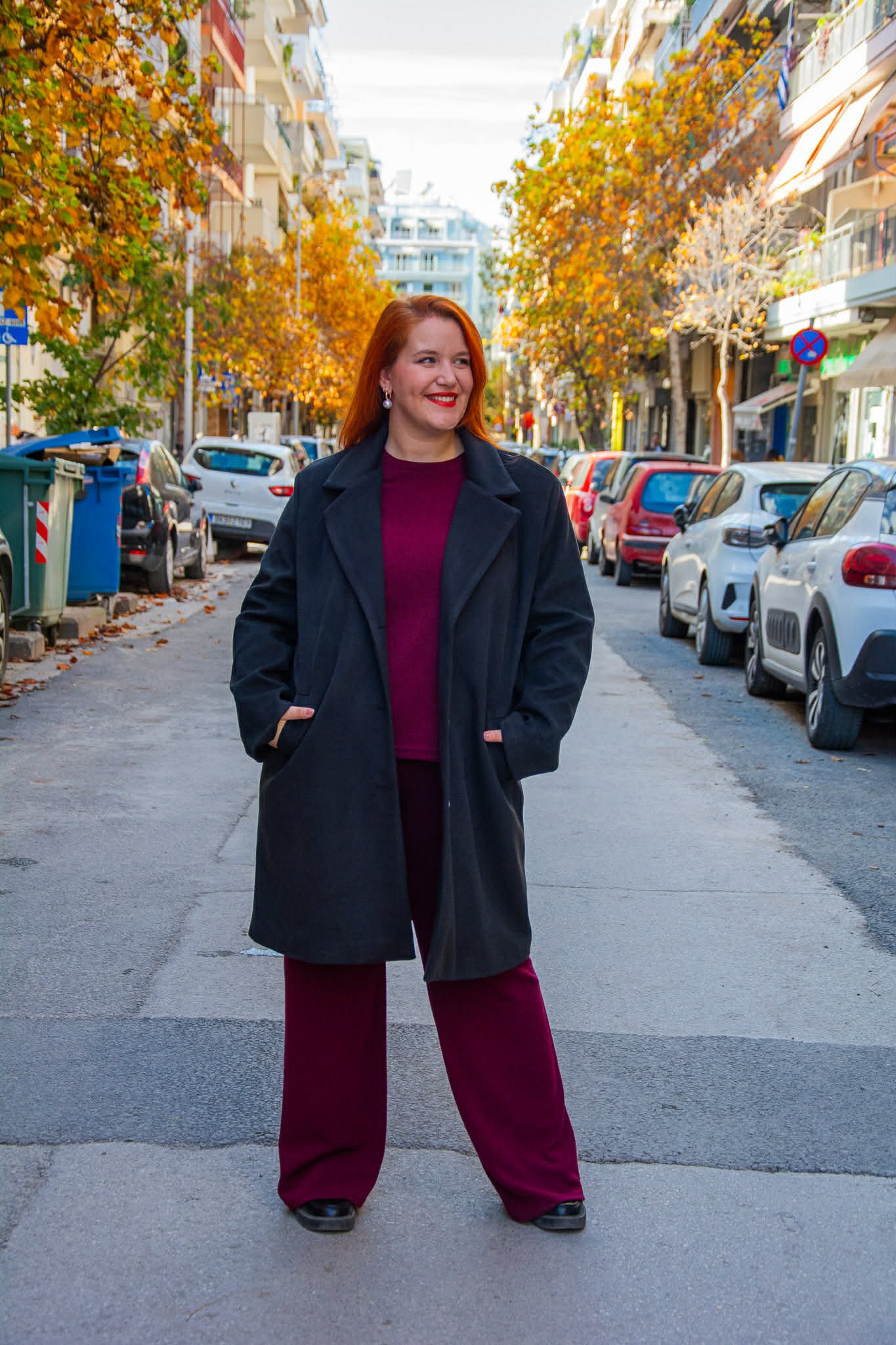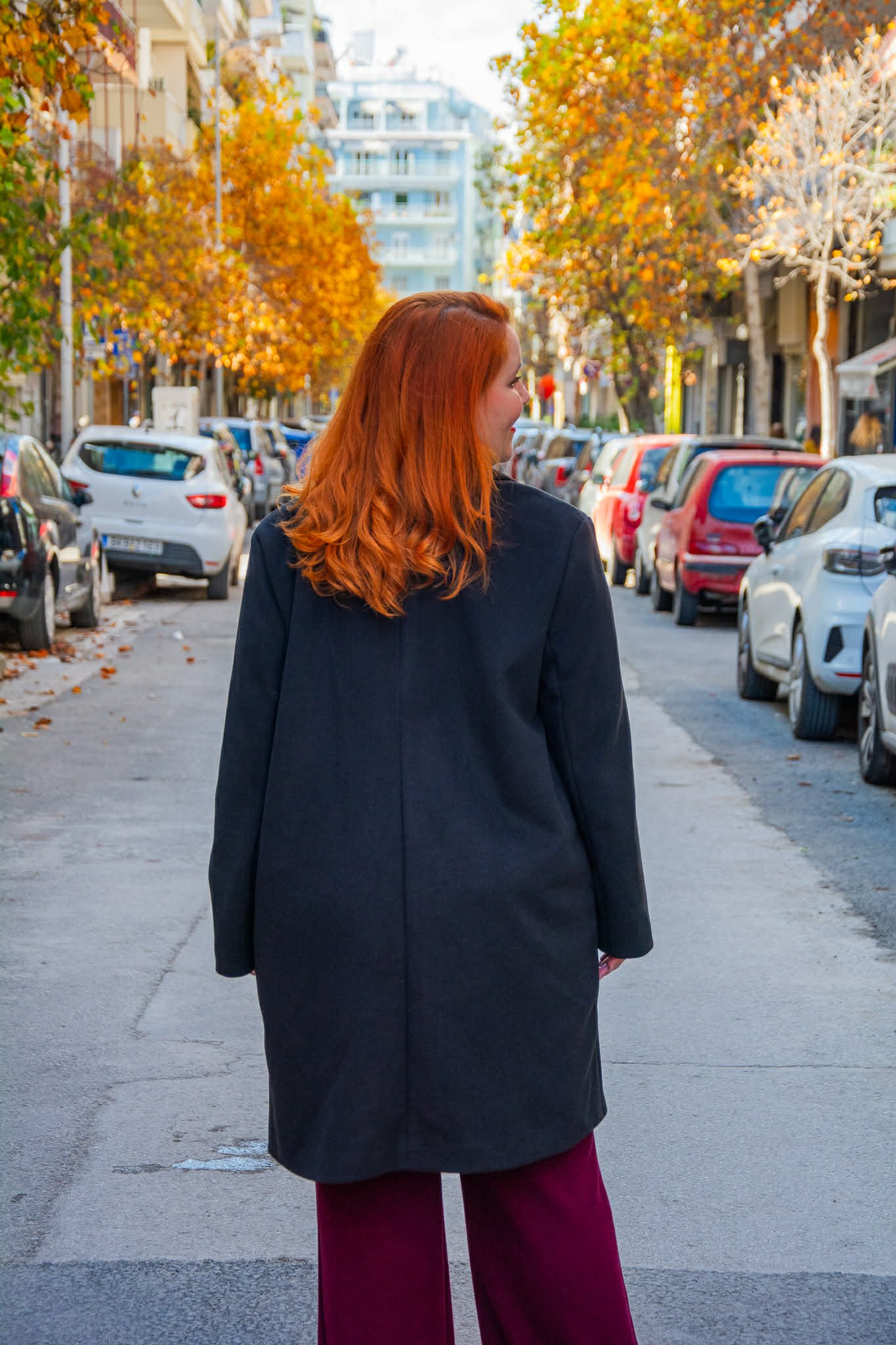 Παλτό, σε μεγάλα μεγέθη, με πέτο στο γιακά, δύο τσέπες, τρία κουμπιά. Είναι φοδραρισμένο, σε ίσια γραμμή με μάκρος μέχρι το γόνατο.