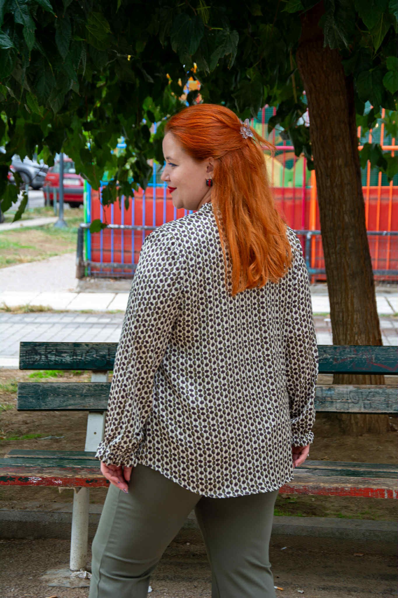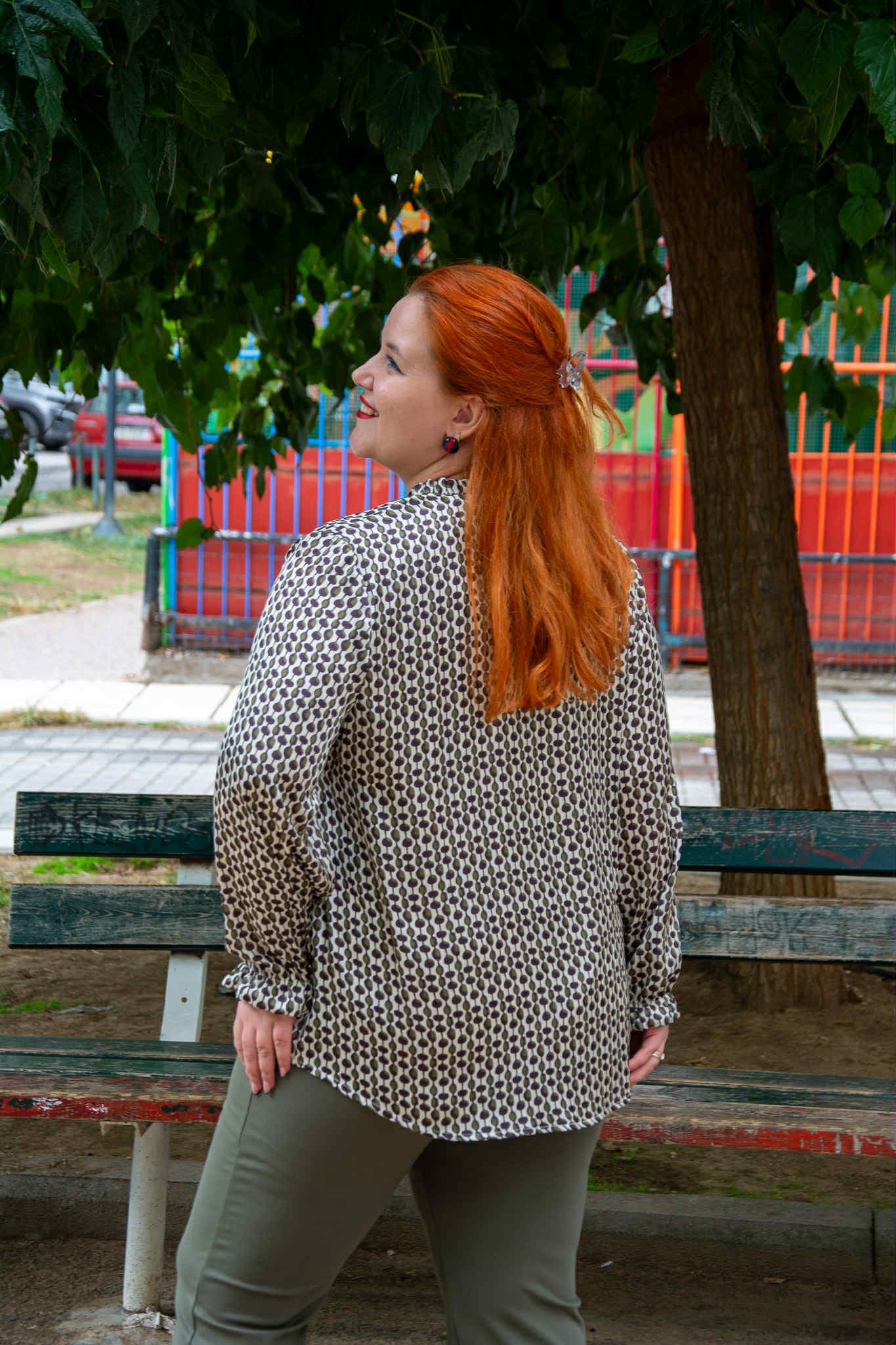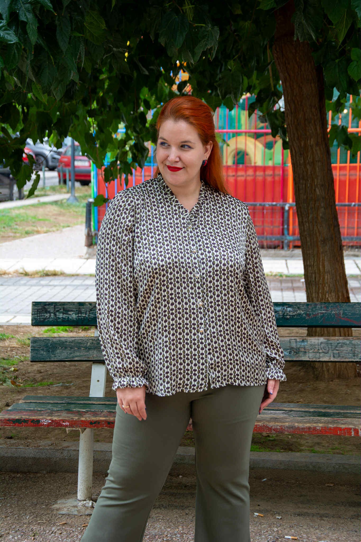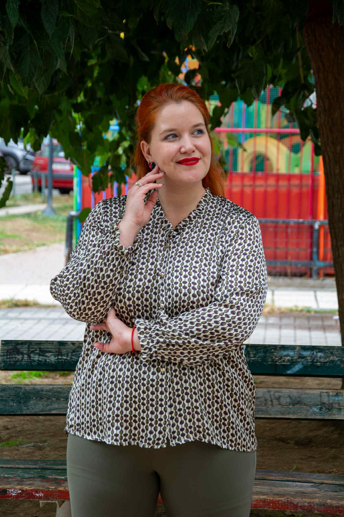 Πουκάμισο, σε μεγάλα μεγέθη. Είναι σε ίσια γραμμή και φοδραρισμένο. Έχει V-ντεκολτέ και βολανάκι στο μανίκι.