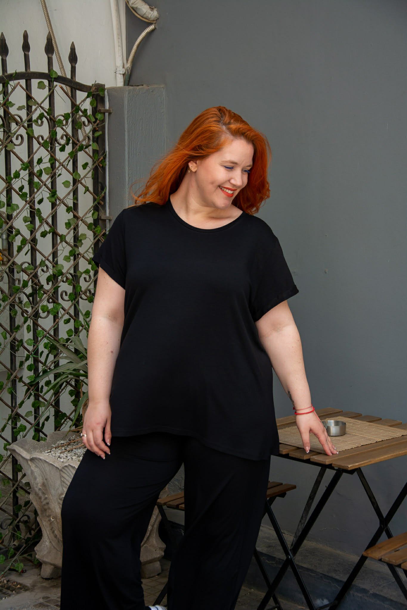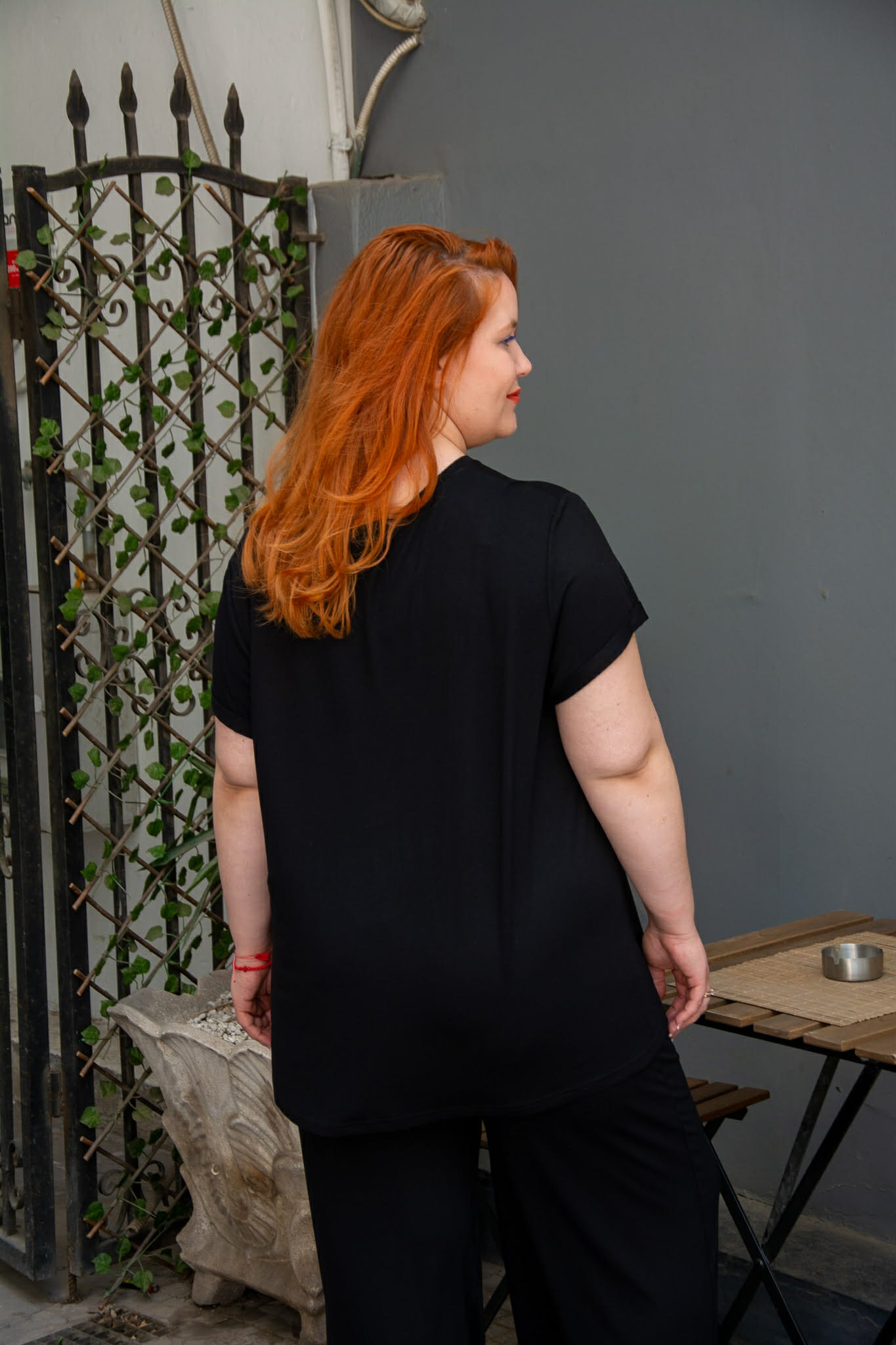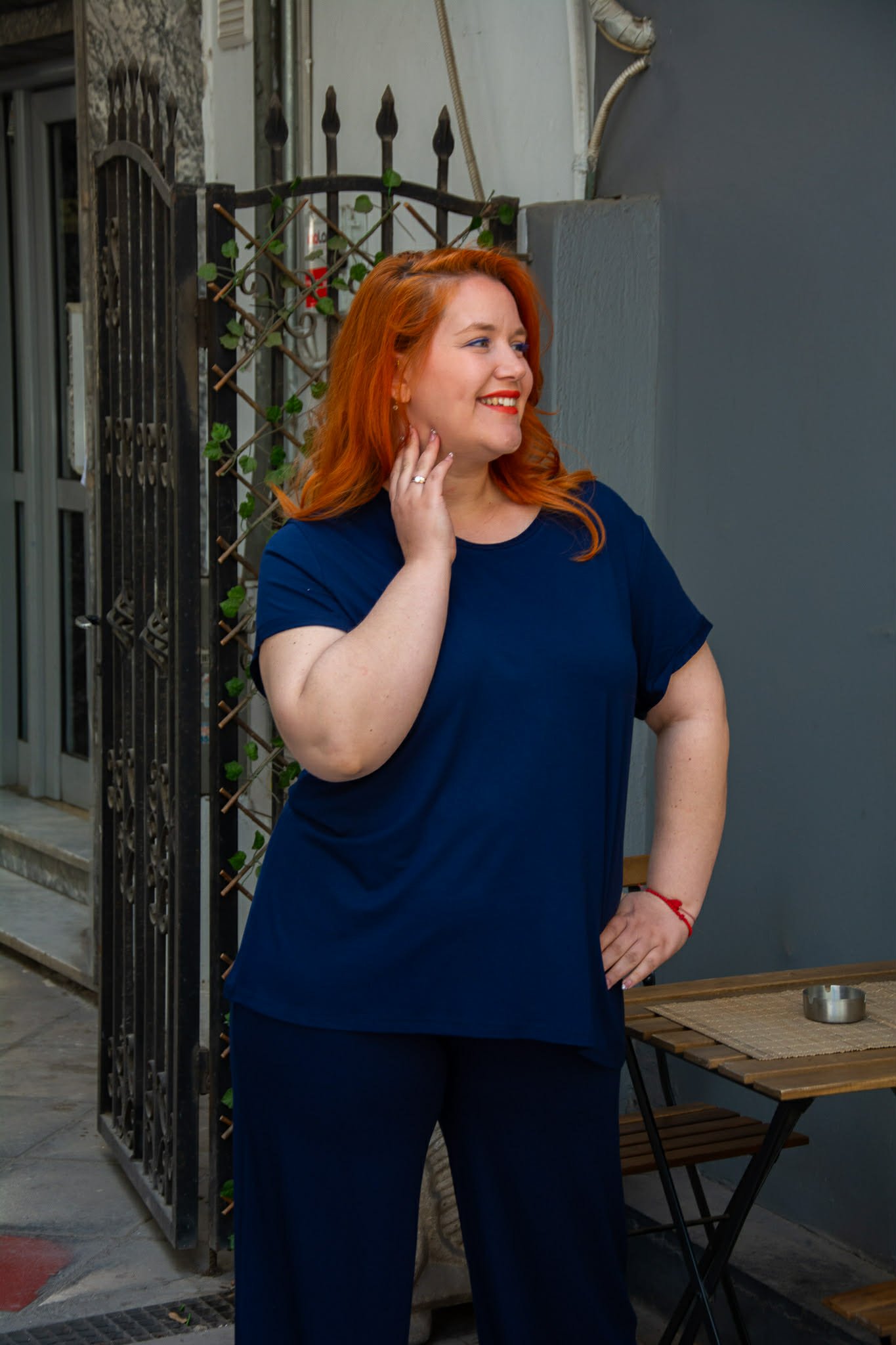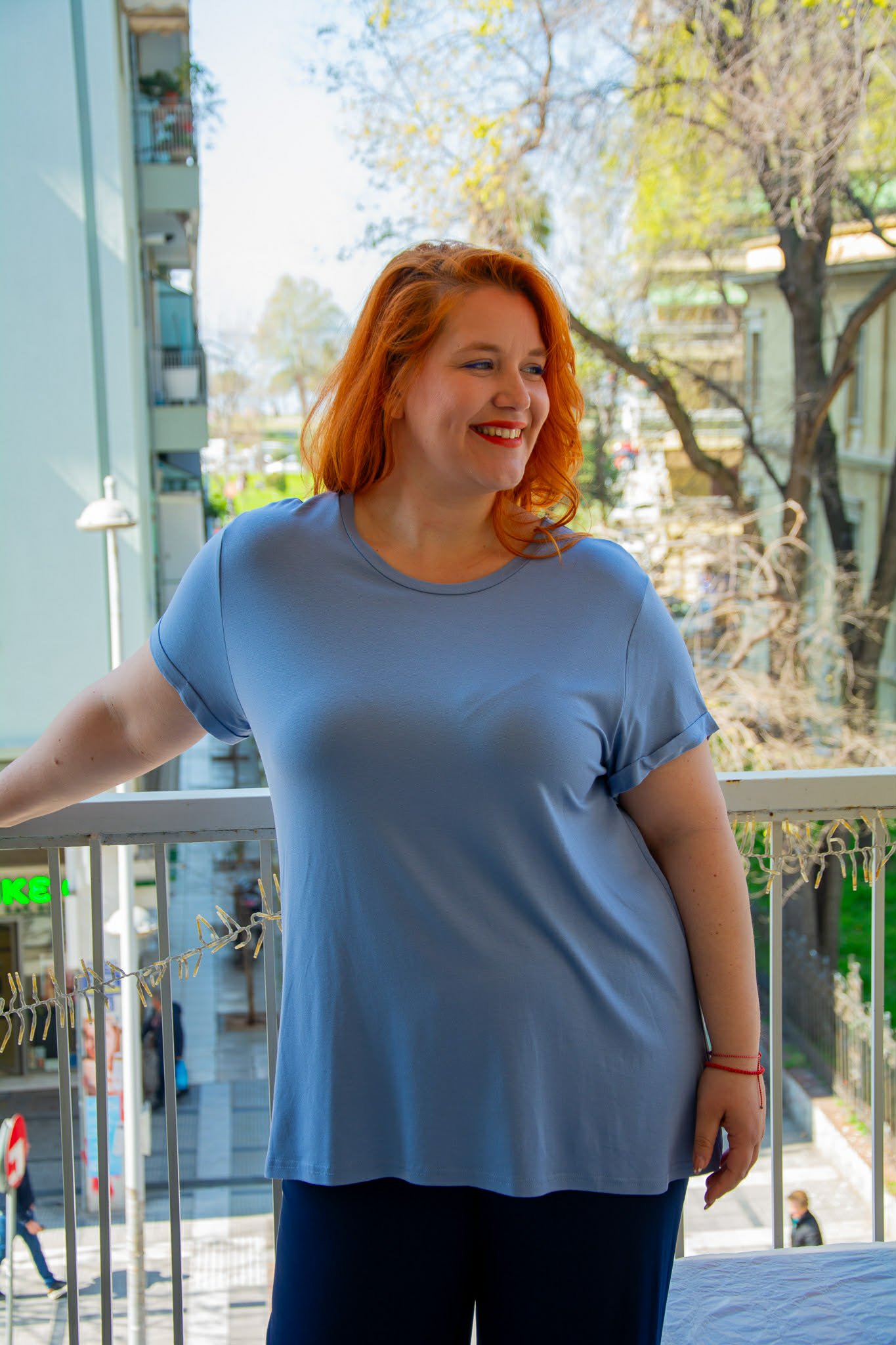 Μπλούζα, σε μεγάλα μεγέθη. Είναι κοντομάνικη με ρεβέρ στο μανίκι. Έχει στρογγυλή λαιμόκοψη. Είναι σε ίσια άνετη γραμμή και καλύπτει περιφέρεια.