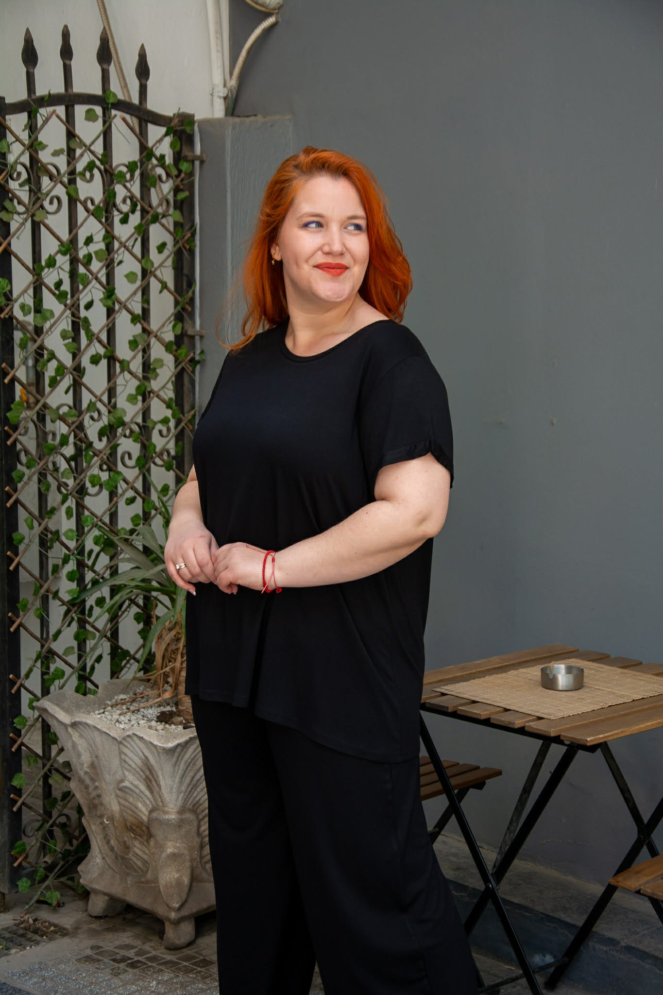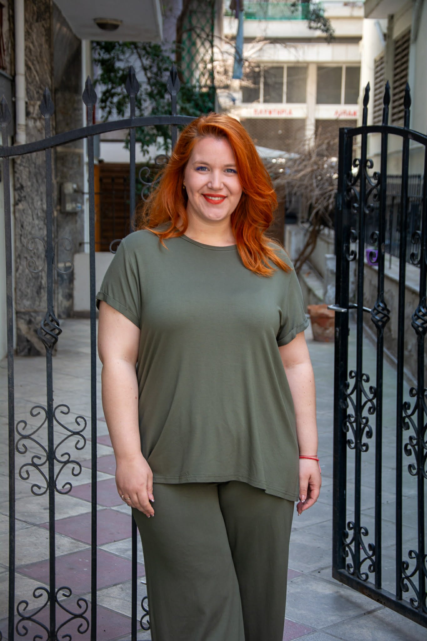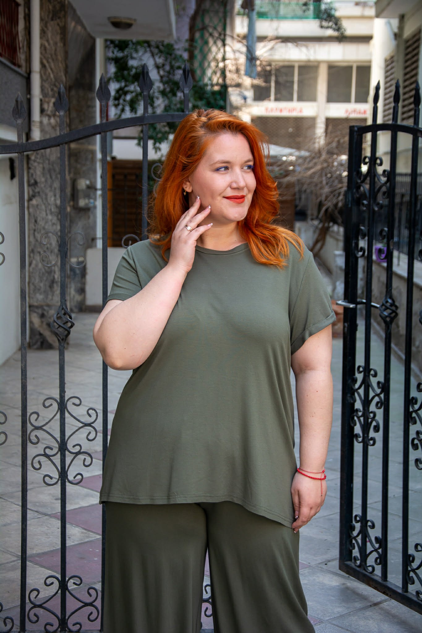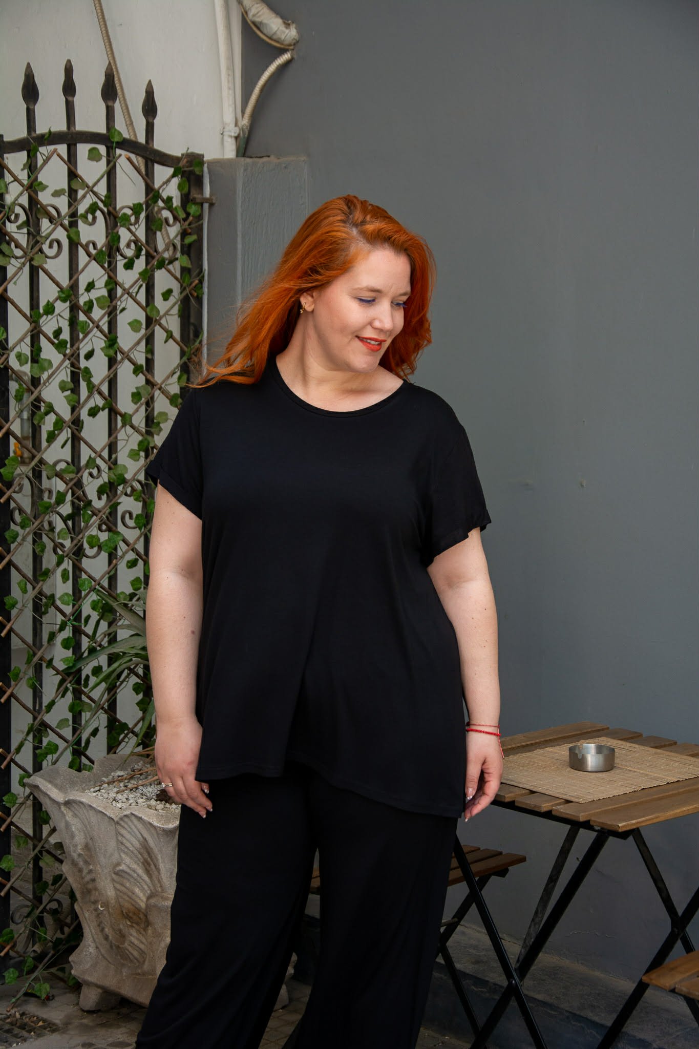 Μπλούζα, σε μεγάλα μεγέθη. Είναι κοντομάνικη με ρεβέρ στο μανίκι. Έχει στρογγυλή λαιμόκοψη. Είναι σε ίσια άνετη γραμμή και καλύπτει περιφέρεια.