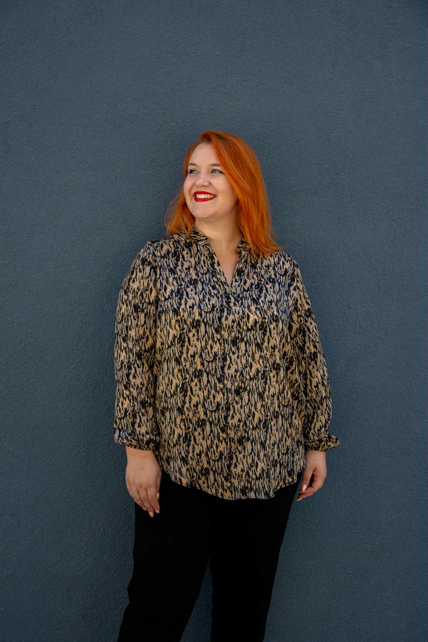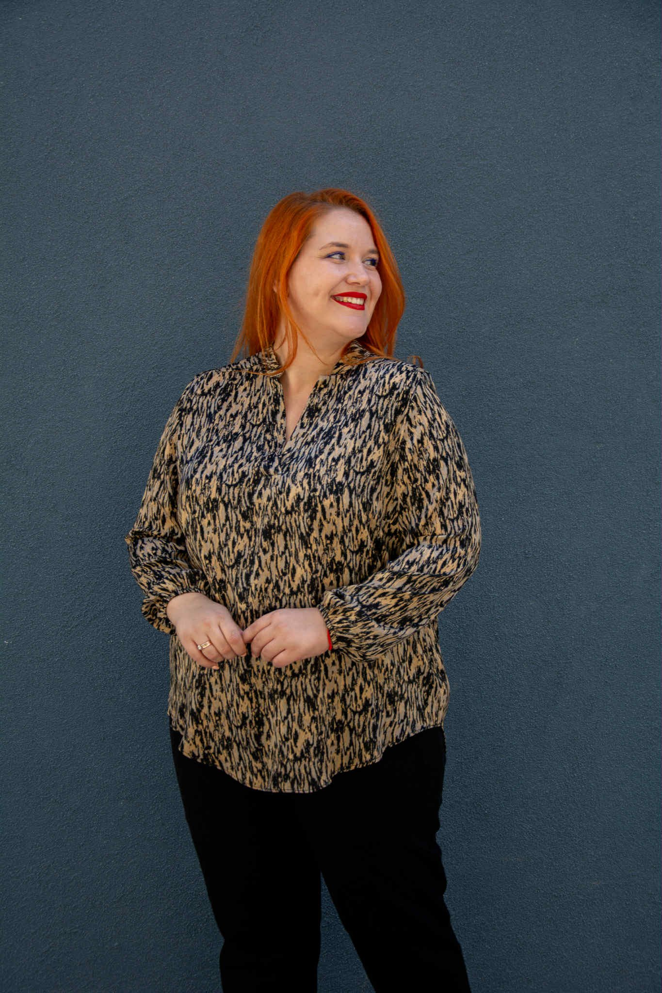 Μπλούζα, σε μεγάλο μέγεθος. Είναι μακριά και έχει μάο V-ντεκολτέ και λάστιχο στο τελείωμα του μανικιού.