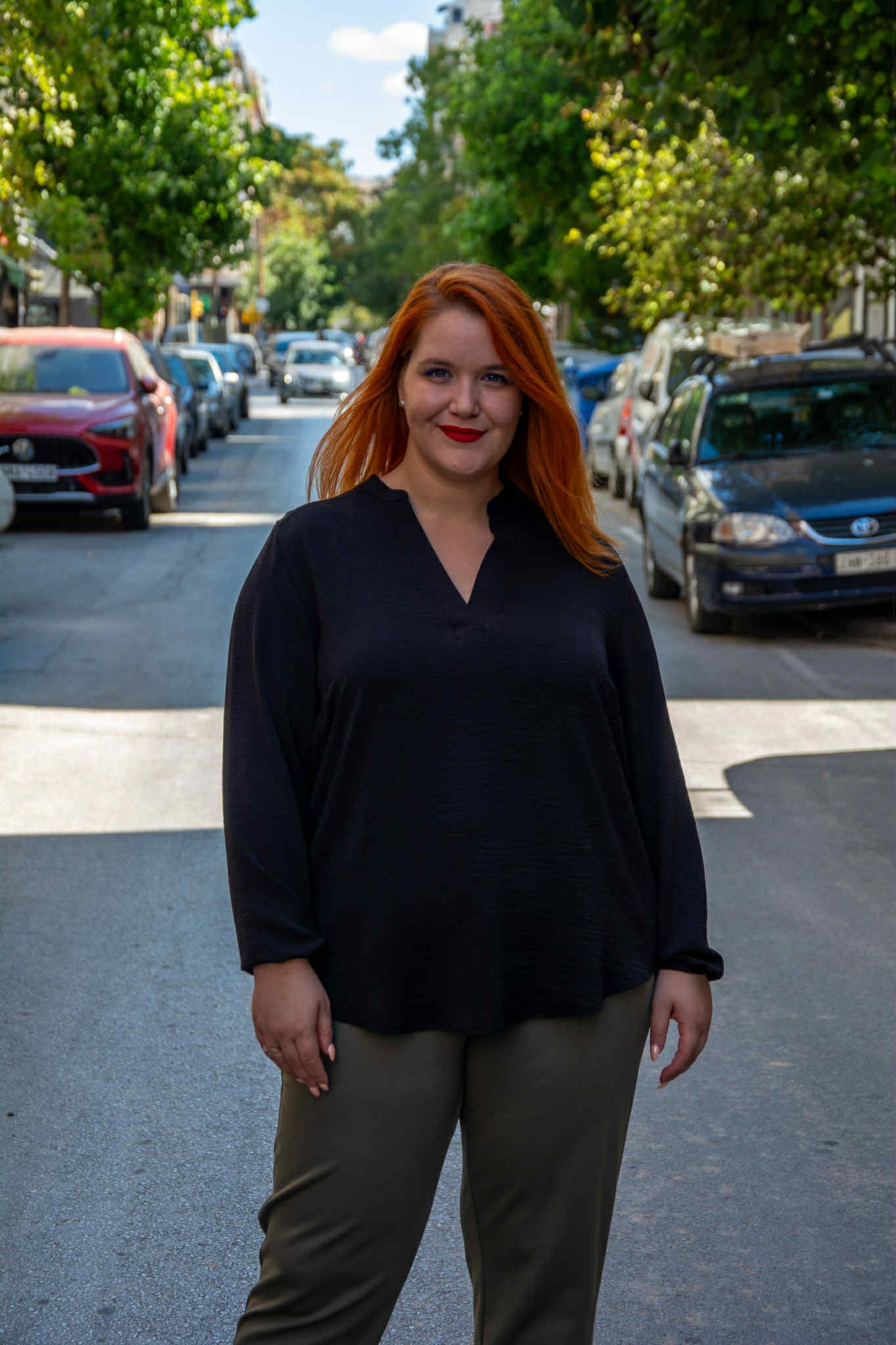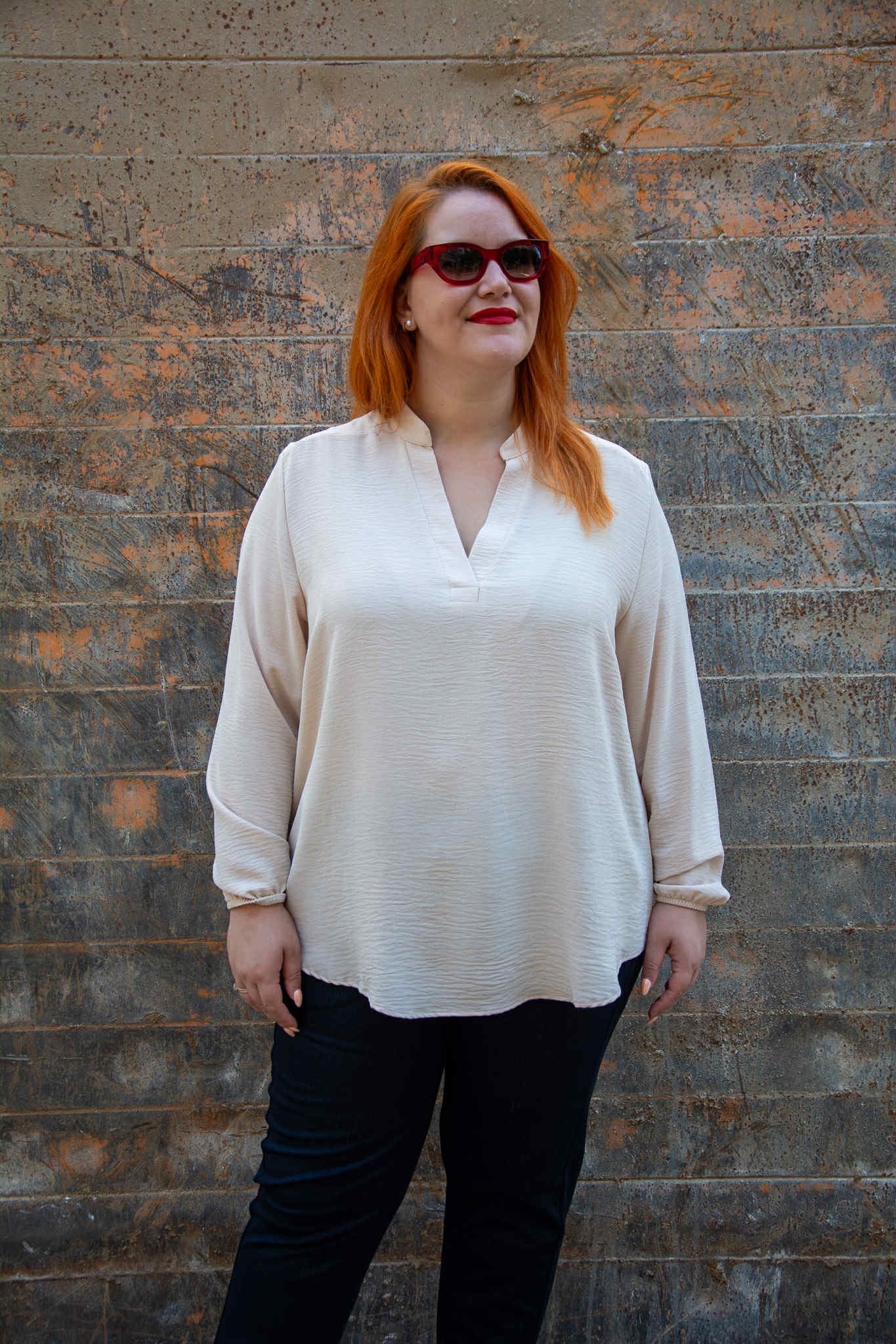 Μπλούζα, σε μεγάλο μέγεθος. Είναι μακριά και έχει μάο V-ντεκολτέ και λάστιχο στο τελείωμα του μανικιού.