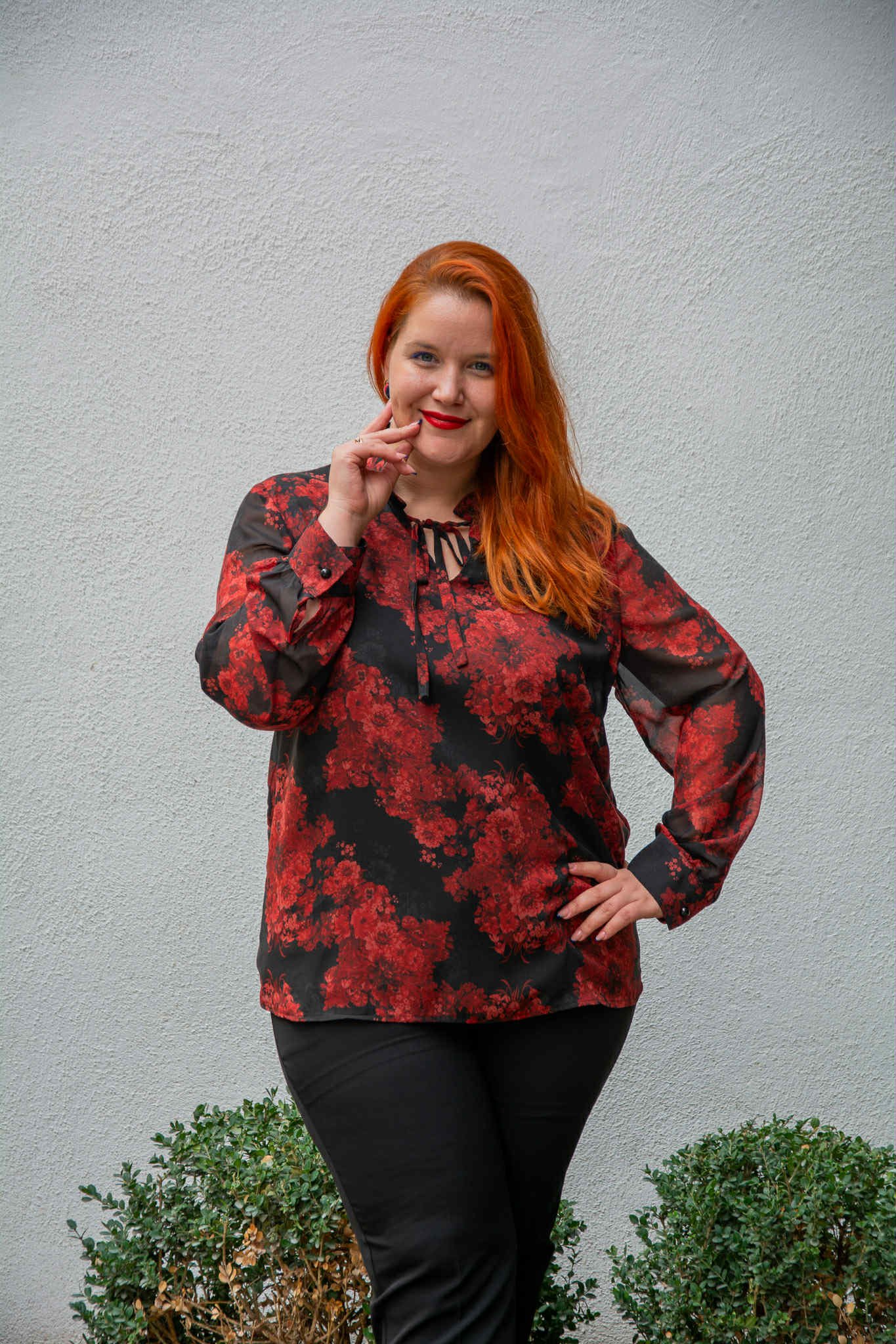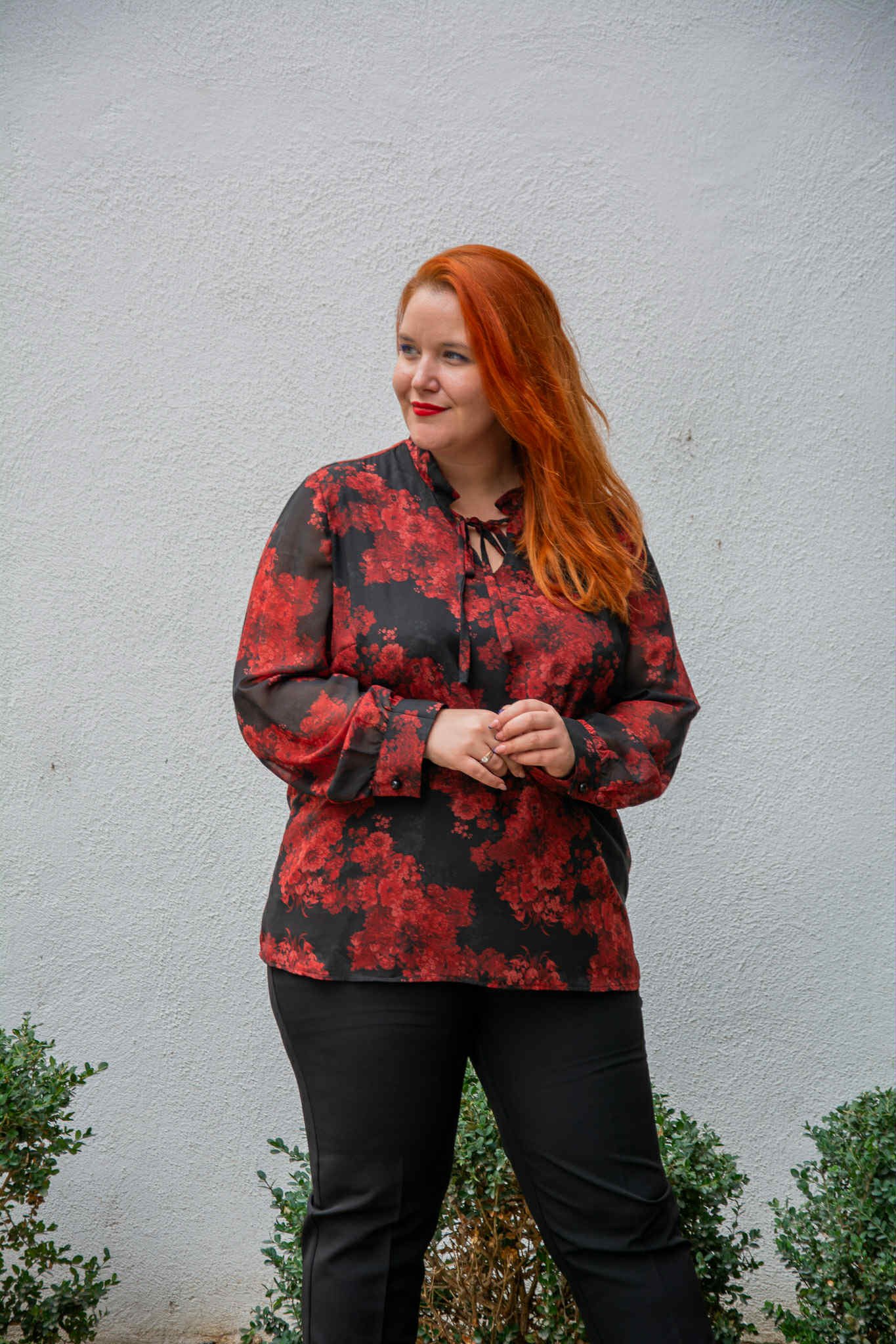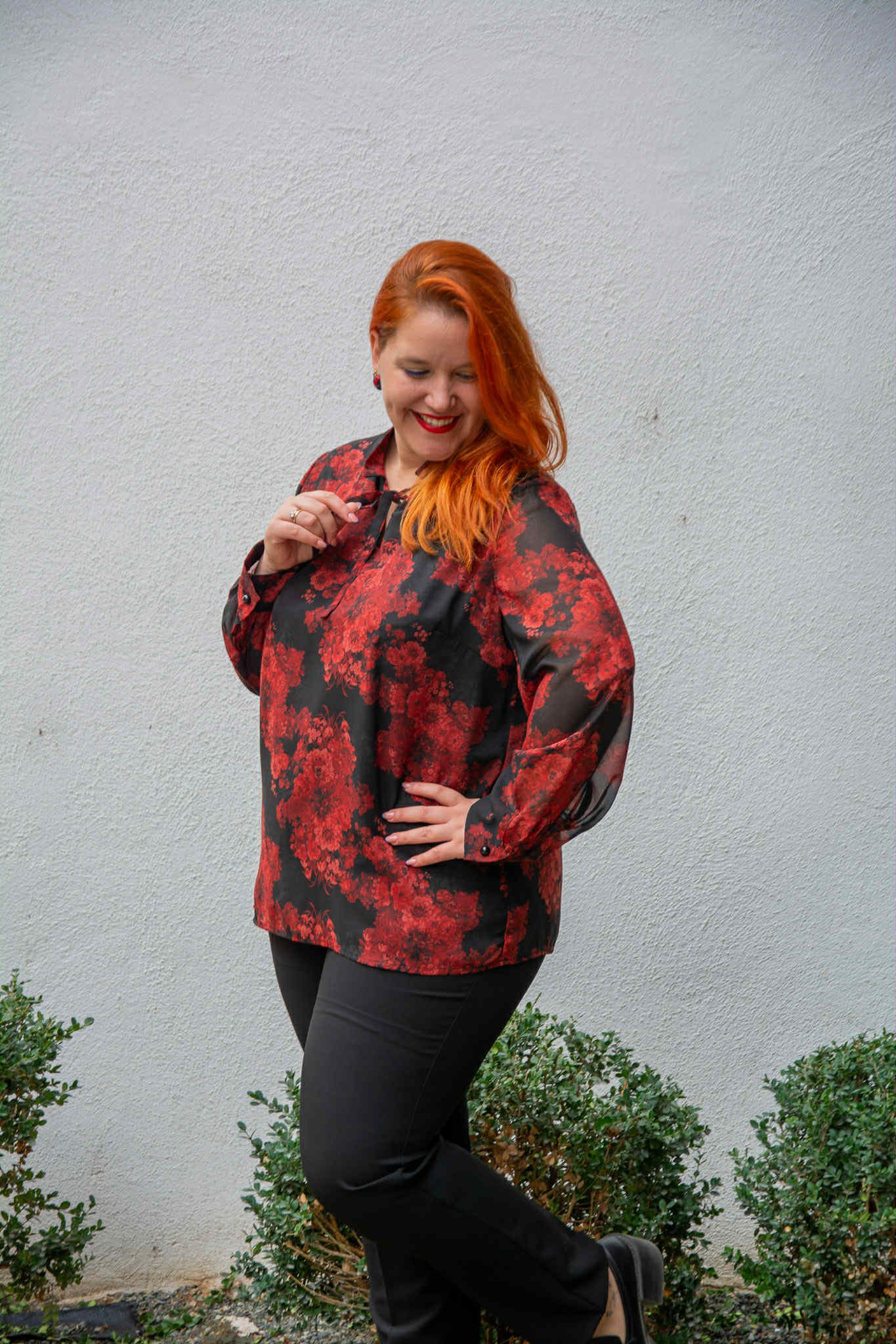 Μπλούζα, σε μεγάλα μεγέθη. Είναι φοδραρισμένη μπρος-πίσω και αφήνει διαφάνεια στα μανίκια, τα οποία κλείνουν με κουμπάκια. Έχει μάο γιακά που δένει στο ντεκολτέ.