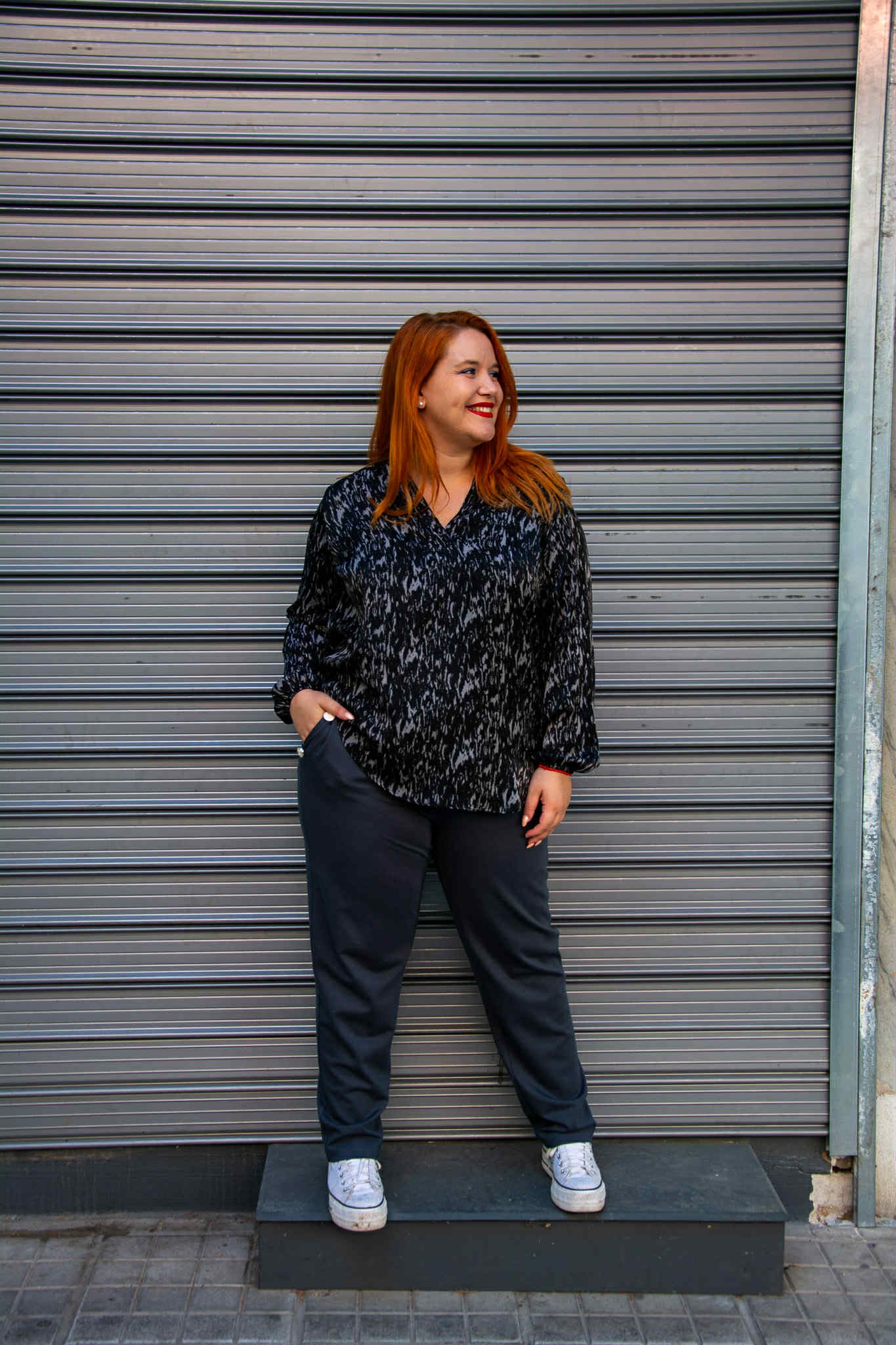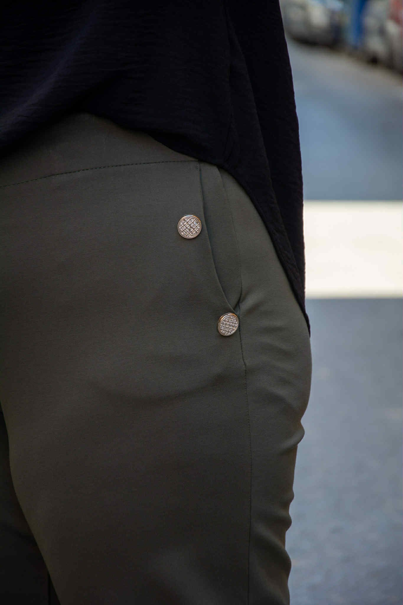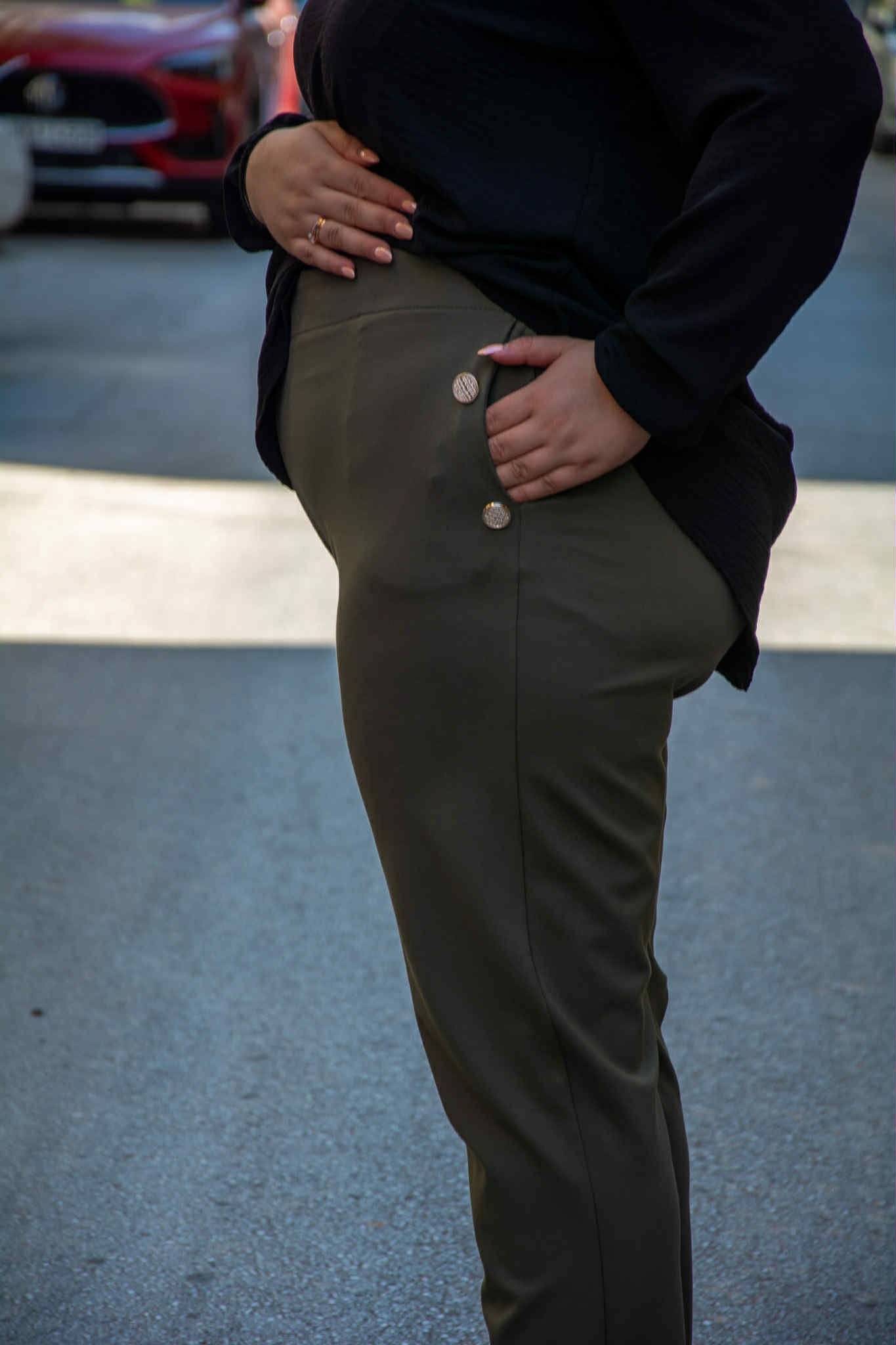 Παντελόνι γραφείου, σε μεγάλα μεγέθη. Διαθέτει λάστιχο στην μέση, πλαϊνές τσέπες και πλαϊνά κουμπιά.