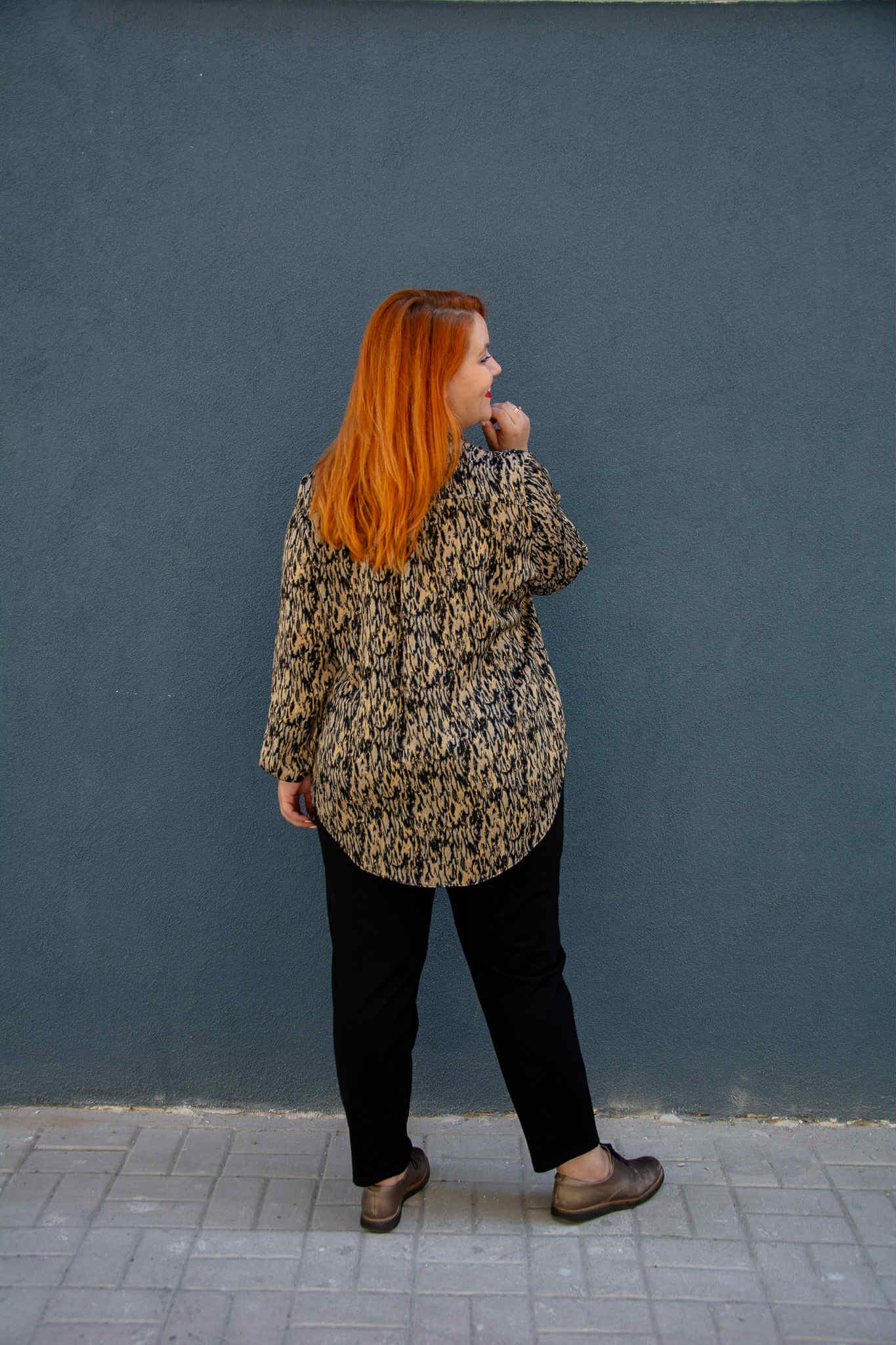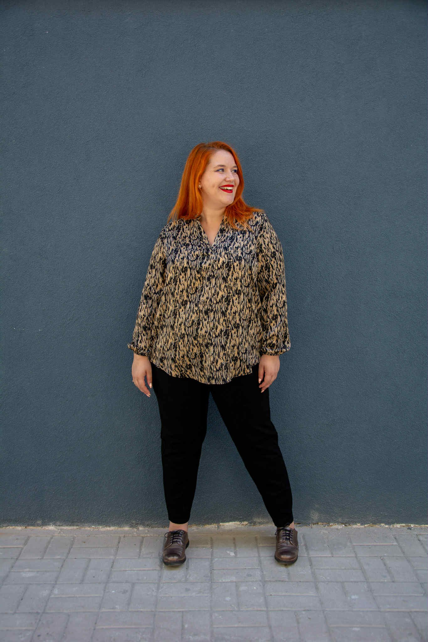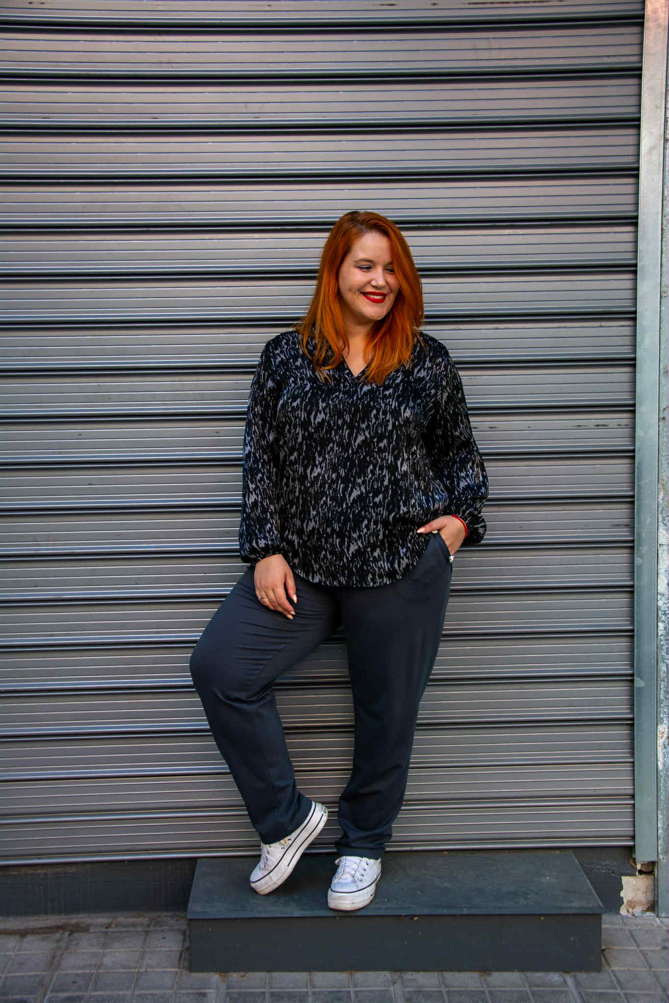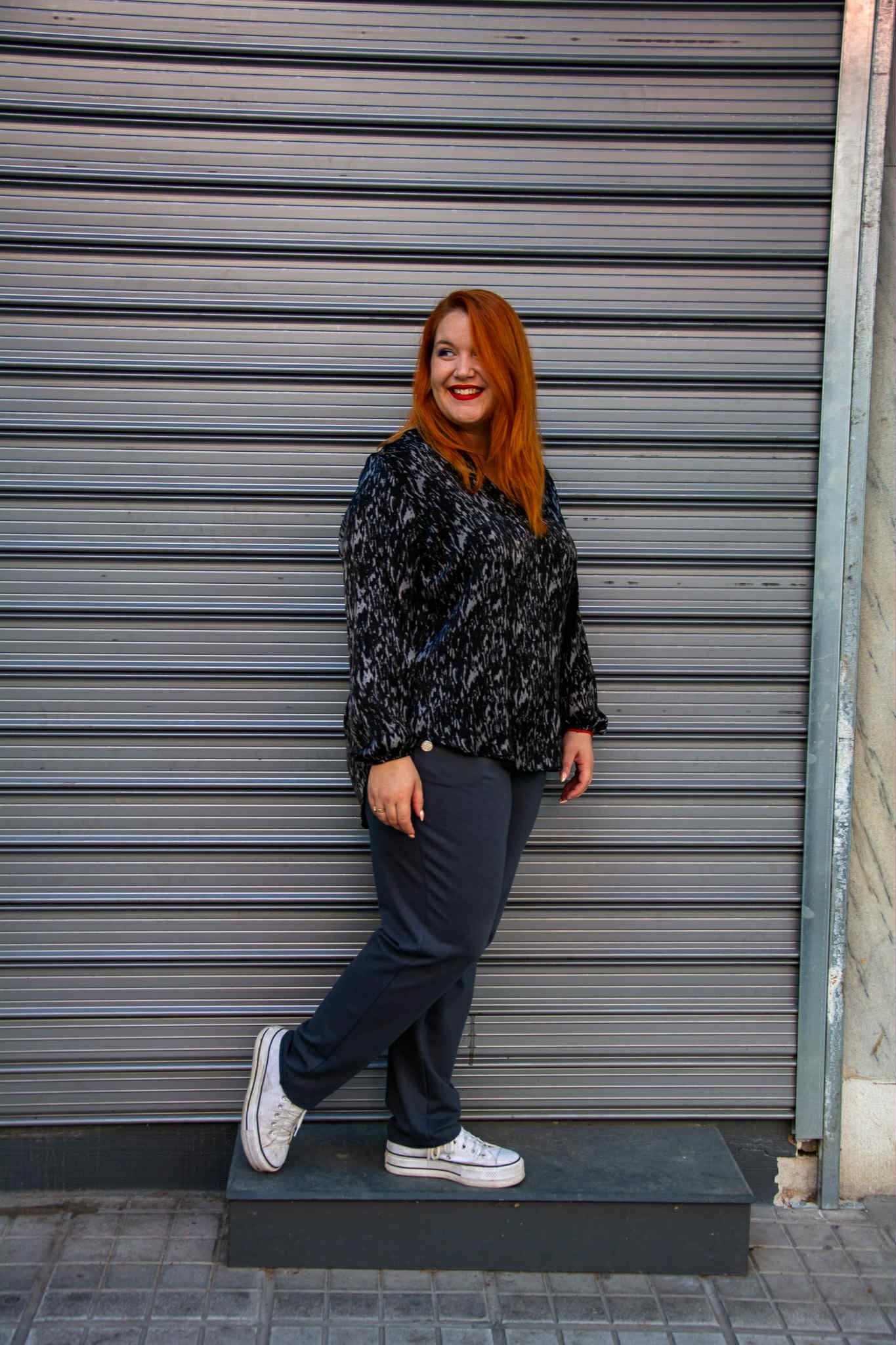 Παντελόνι γραφείου, σε μεγάλα μεγέθη. Διαθέτει λάστιχο στην μέση, πλαϊνές τσέπες και πλαϊνά κουμπιά.