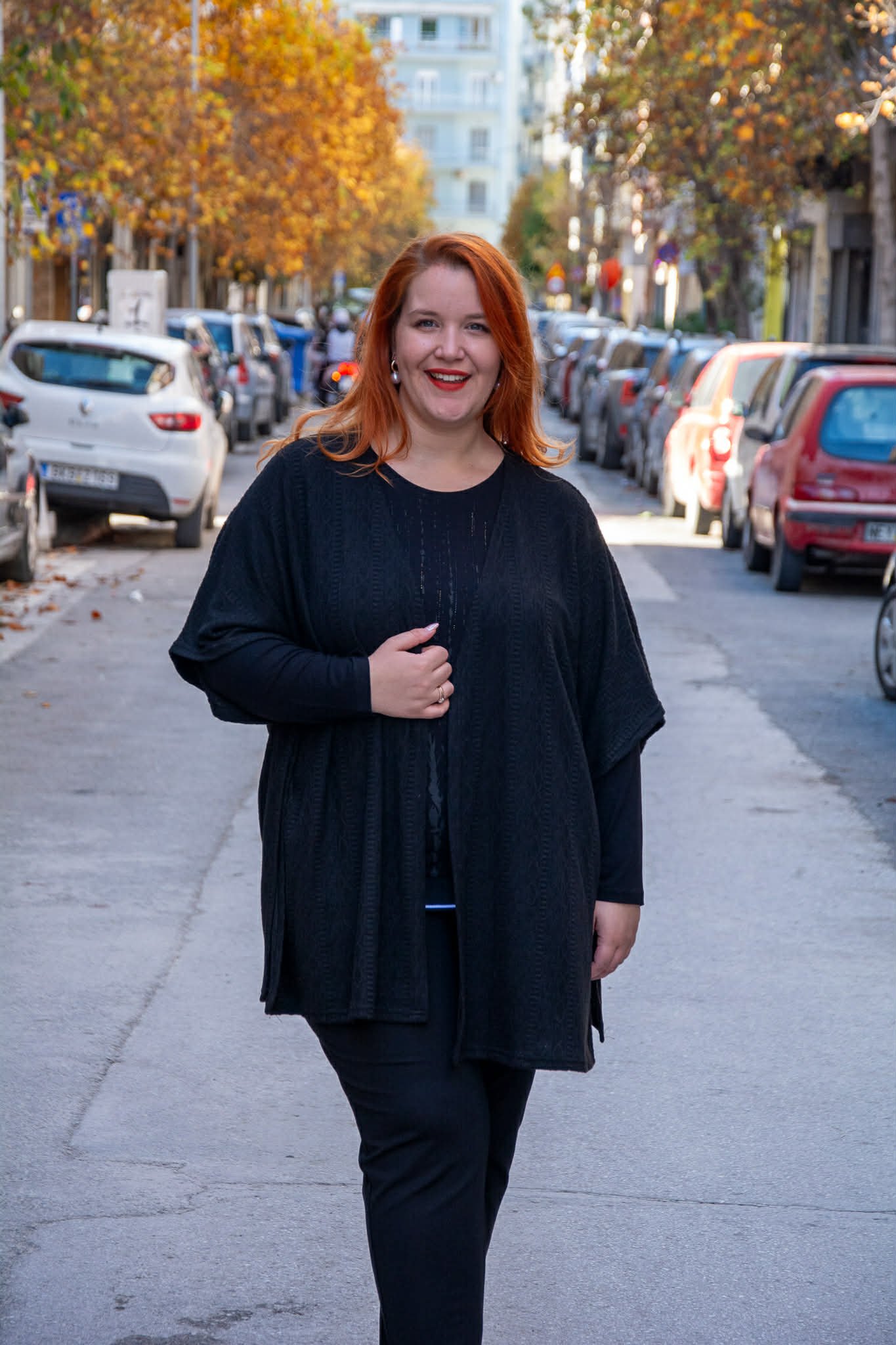 Ζακέτα, σε μεγάλα μεγέθη. Είναι κοντομάνικη, με ελεύθερο άνοιγμα και βαθιά σχισίματα στα πλαϊνά. Καλύπτει περιφέρεια.