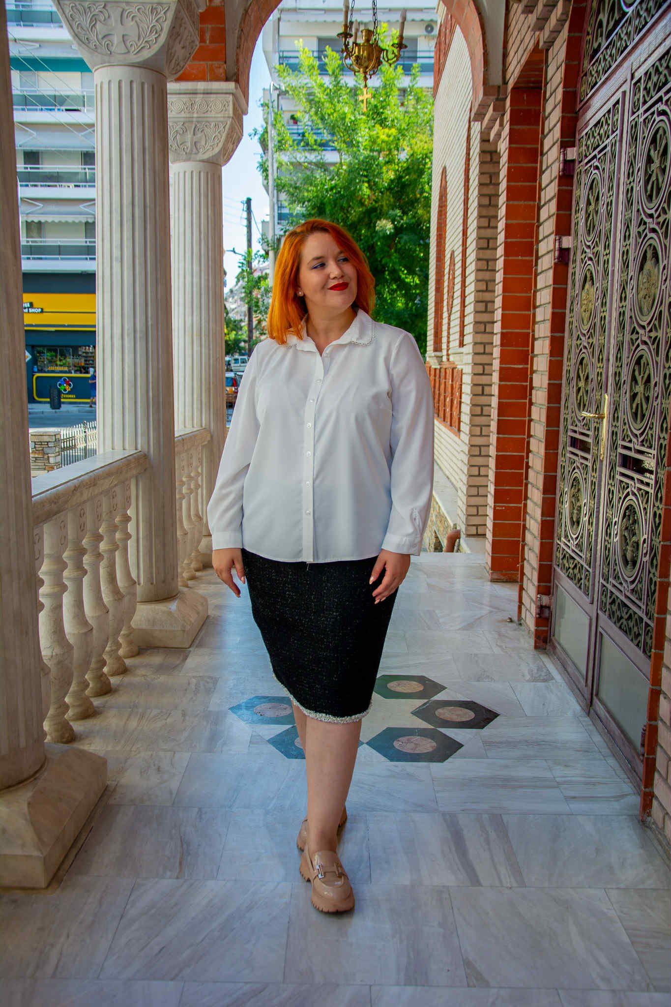 Πουκάμισο κλασσικό, σε μεγάλα μεγέθη. Είναι σε ίσια γραμμή και έχει δαντέλα κιπούρ στο πέτο.