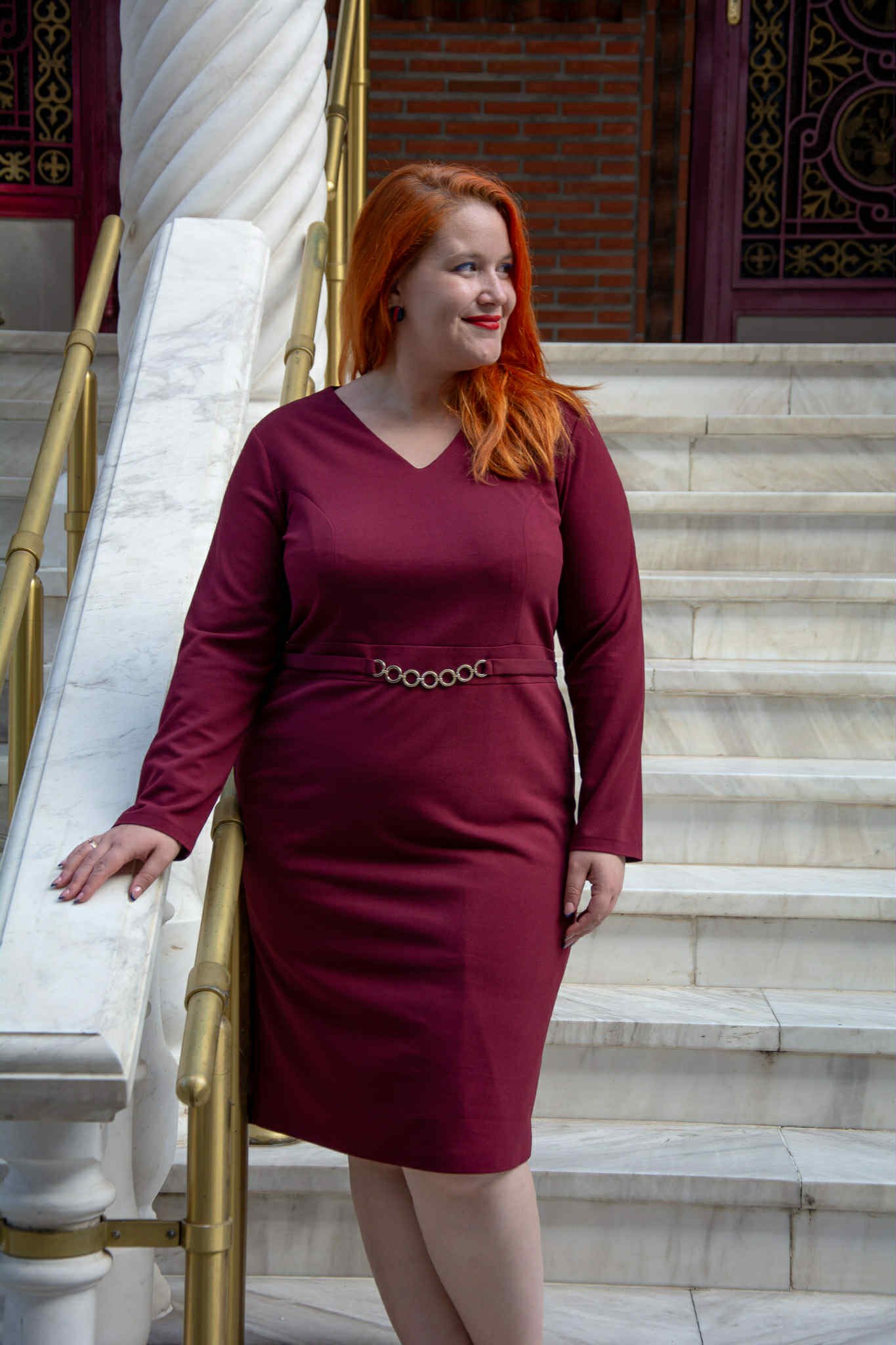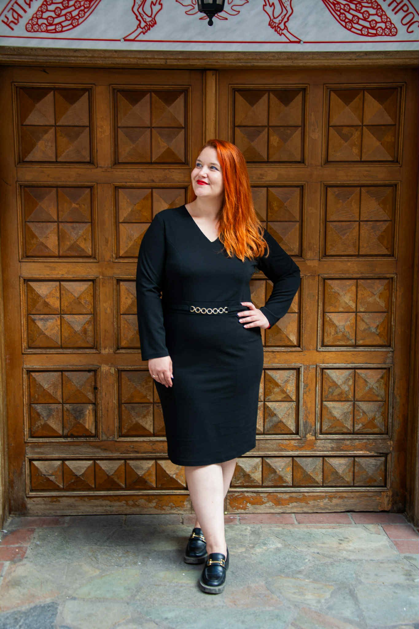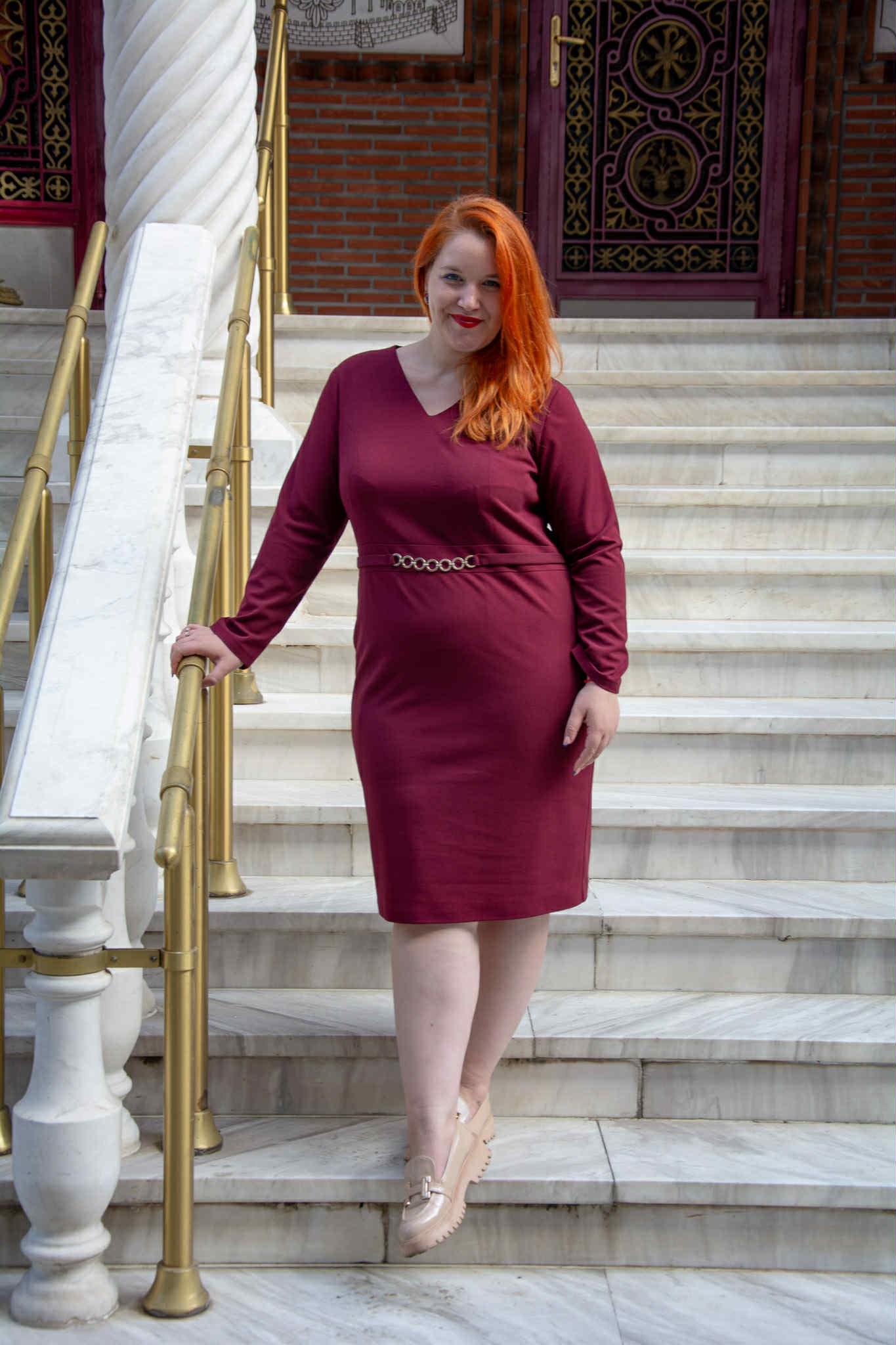 Φόρεμα, σε μεγάλα μεγέθη. Είναι μίντι, σε ίσια γραμμή και V-ντεκολτέ. Κάτω από το στήθος έχει μικρή τρέσα από χρυσούς κρίκους.
