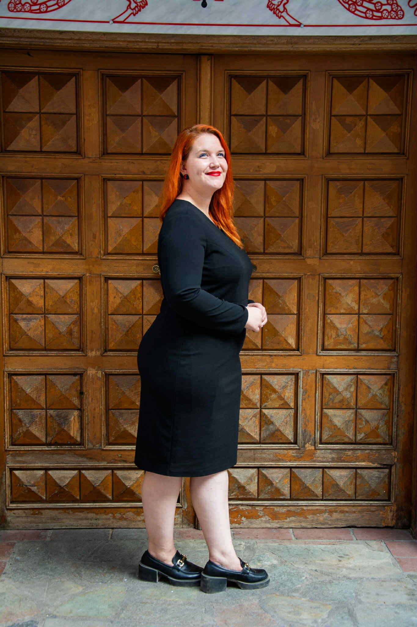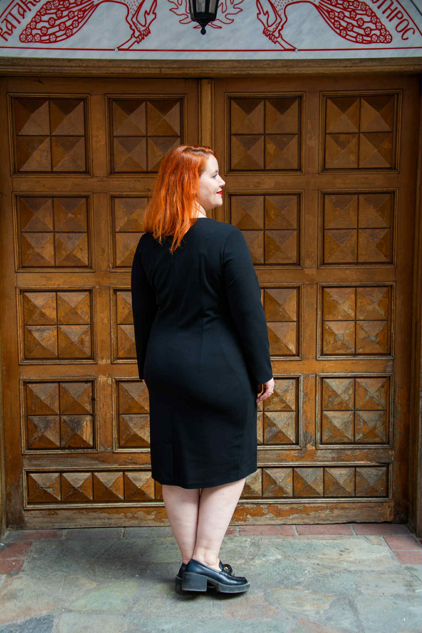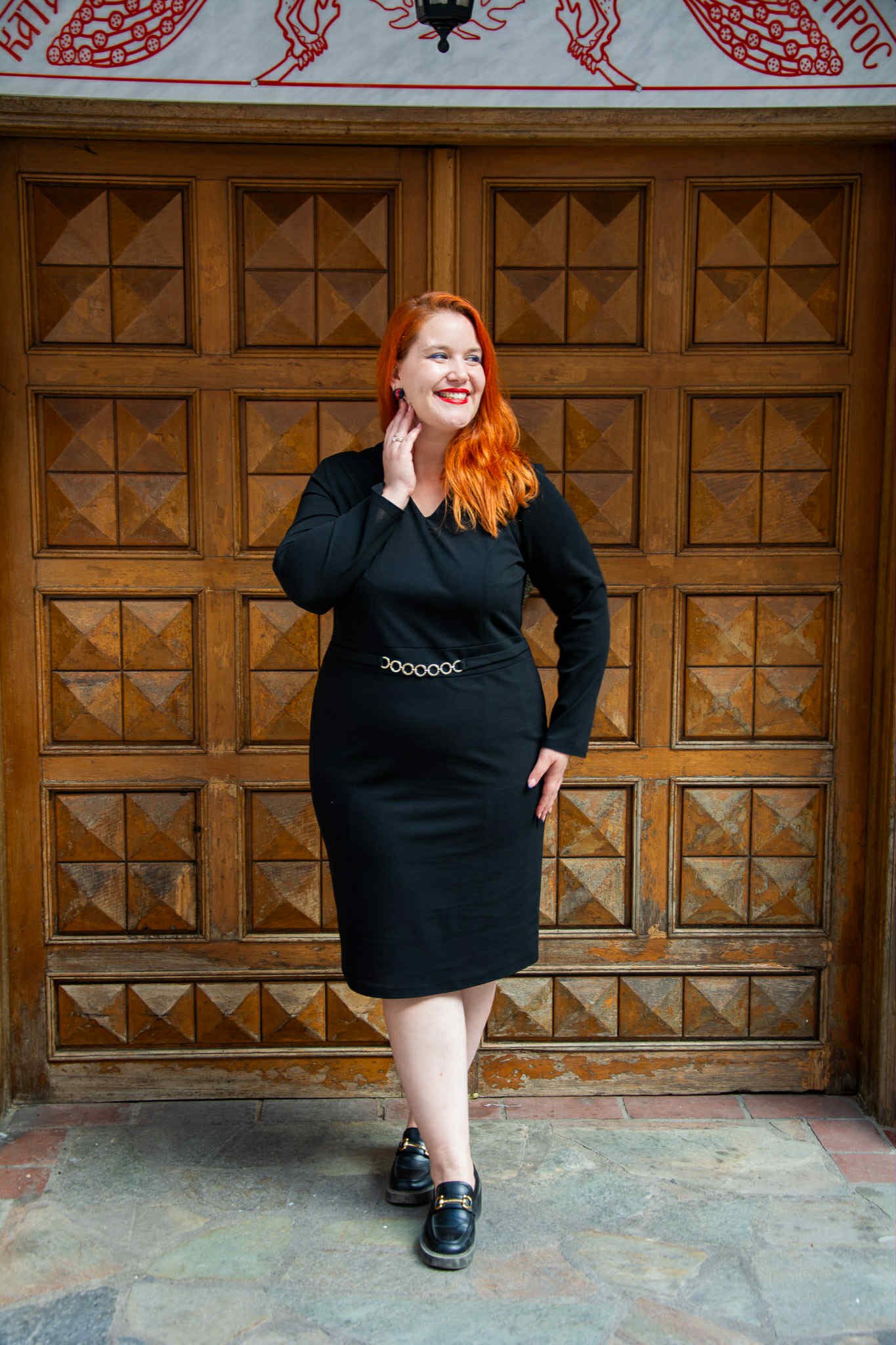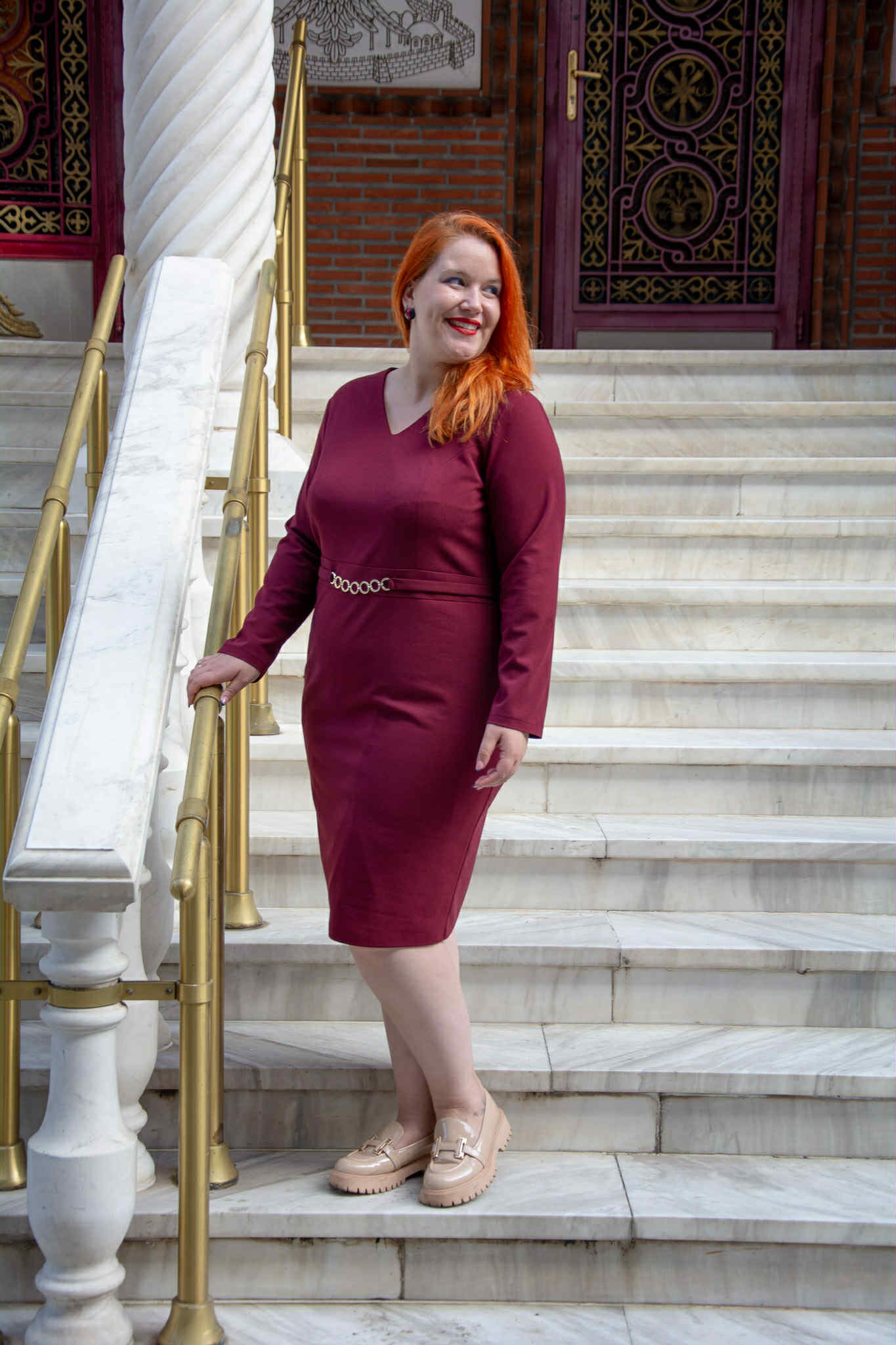 Φόρεμα, σε μεγάλα μεγέθη. Είναι μίντι, σε ίσια γραμμή και V-ντεκολτέ. Κάτω από το στήθος έχει μικρή τρέσα από χρυσούς κρίκους.