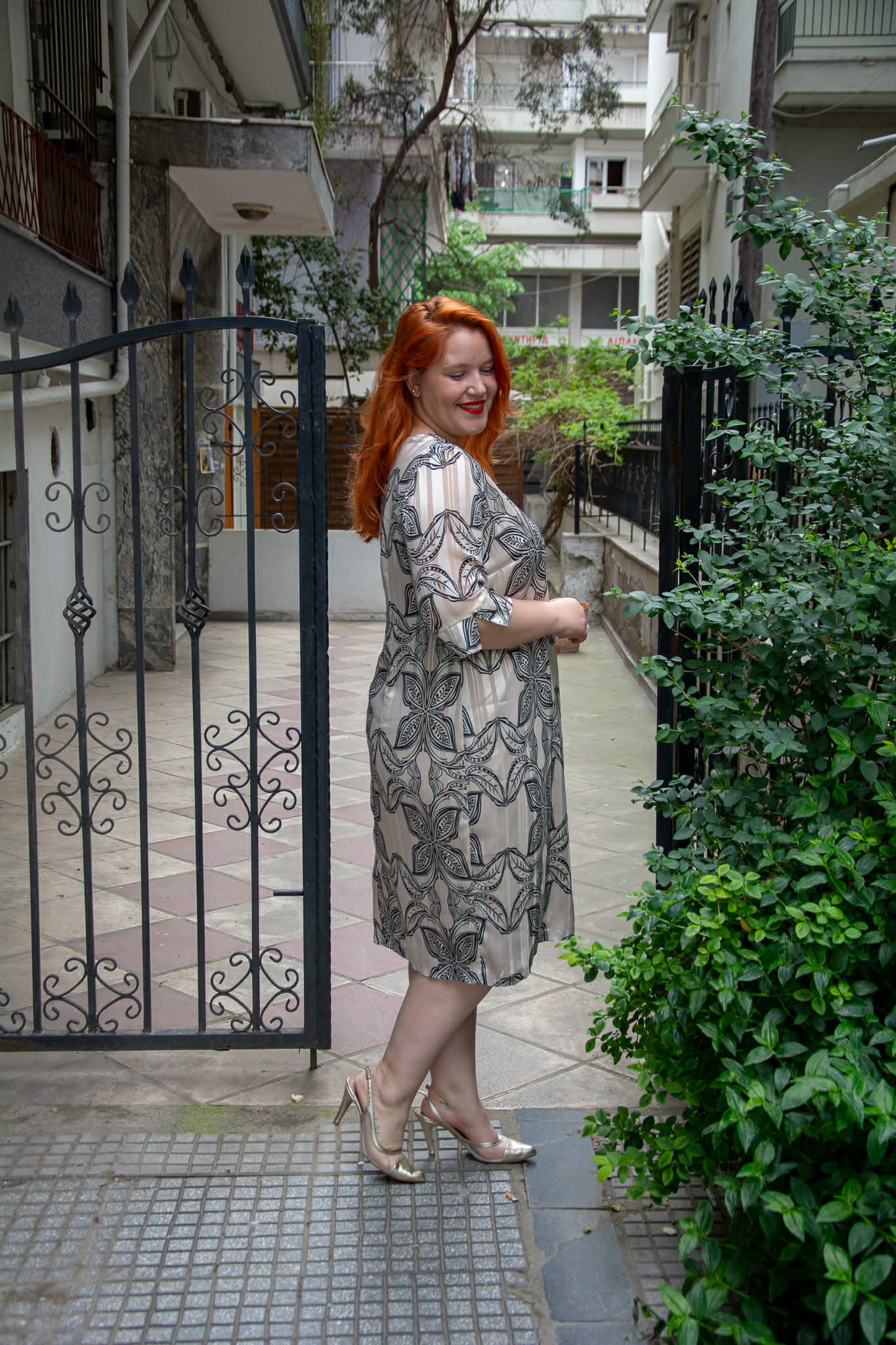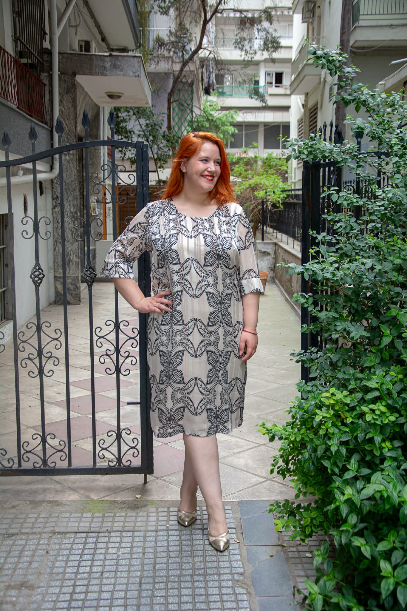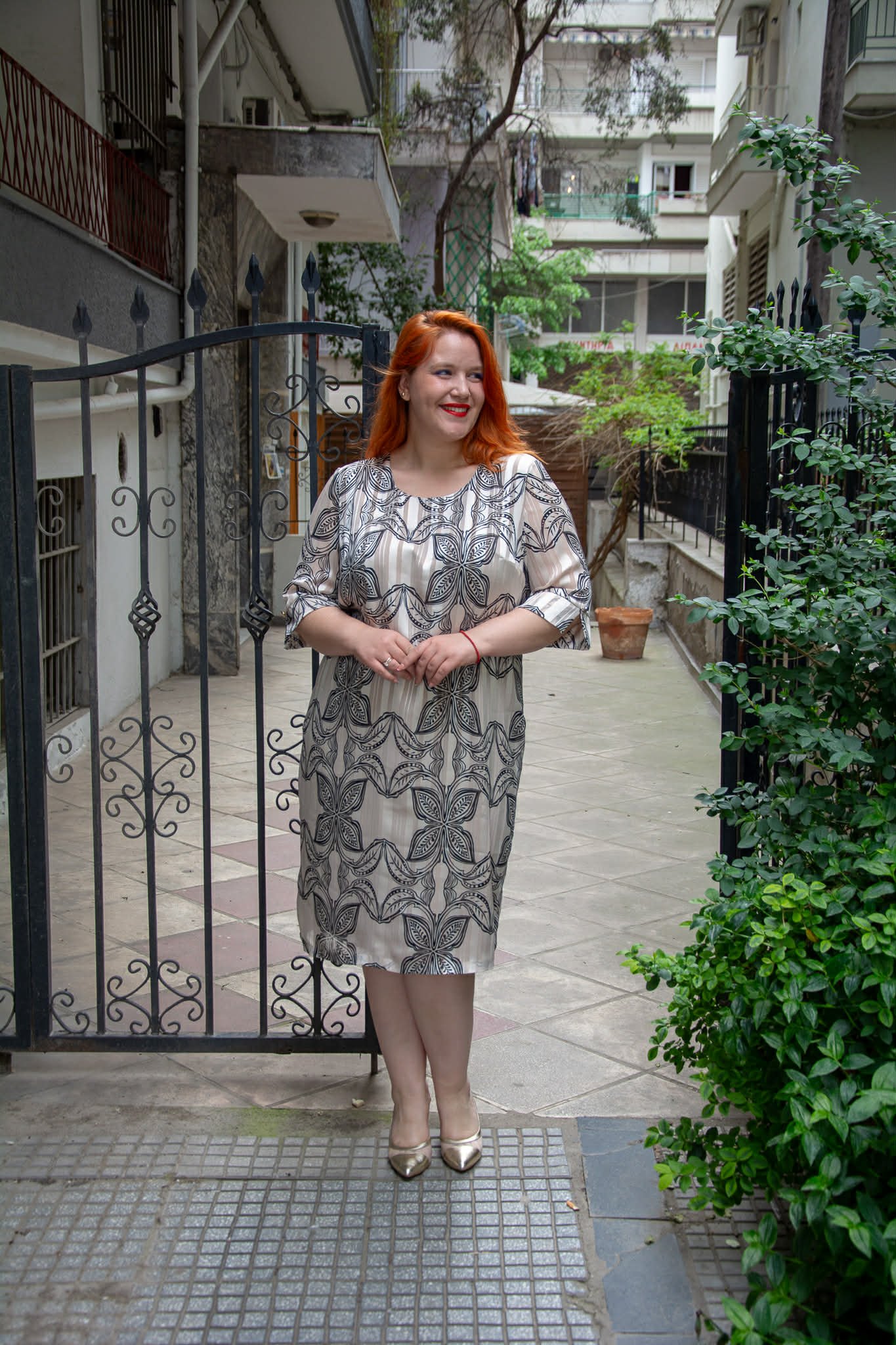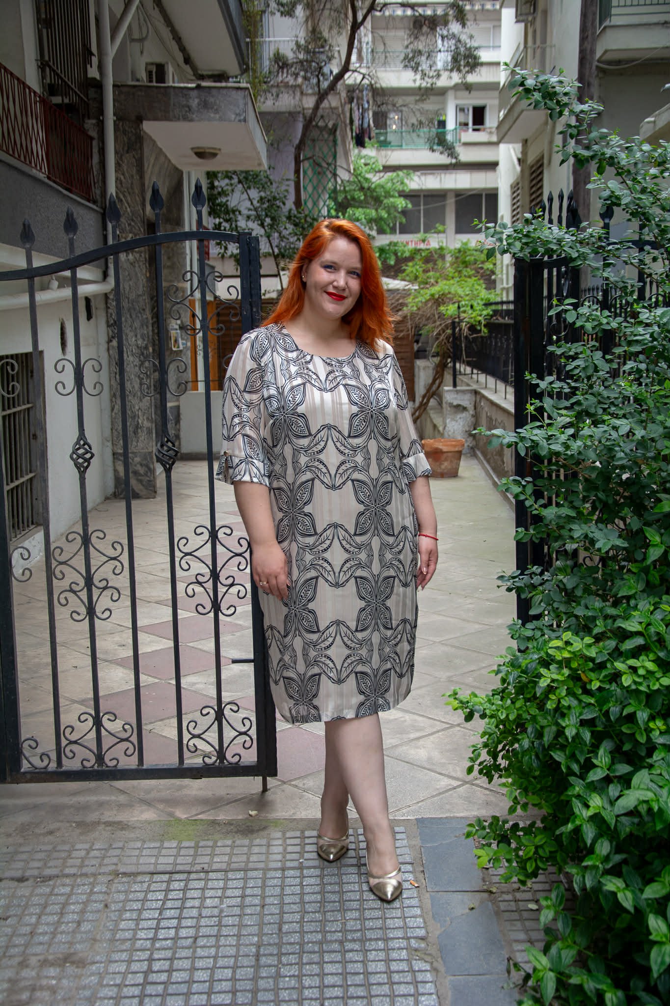Φόρεμα, σε μεγάλα μεγέθη. Είναι μίντι, κοντομάνικο, με στρογγυλή λαιμόκοψη. Είναι εμπριμέ με χρυσοκλωστή, Κλείνει πίσω με φερμουάρ και είναι φοδραρισμένο.