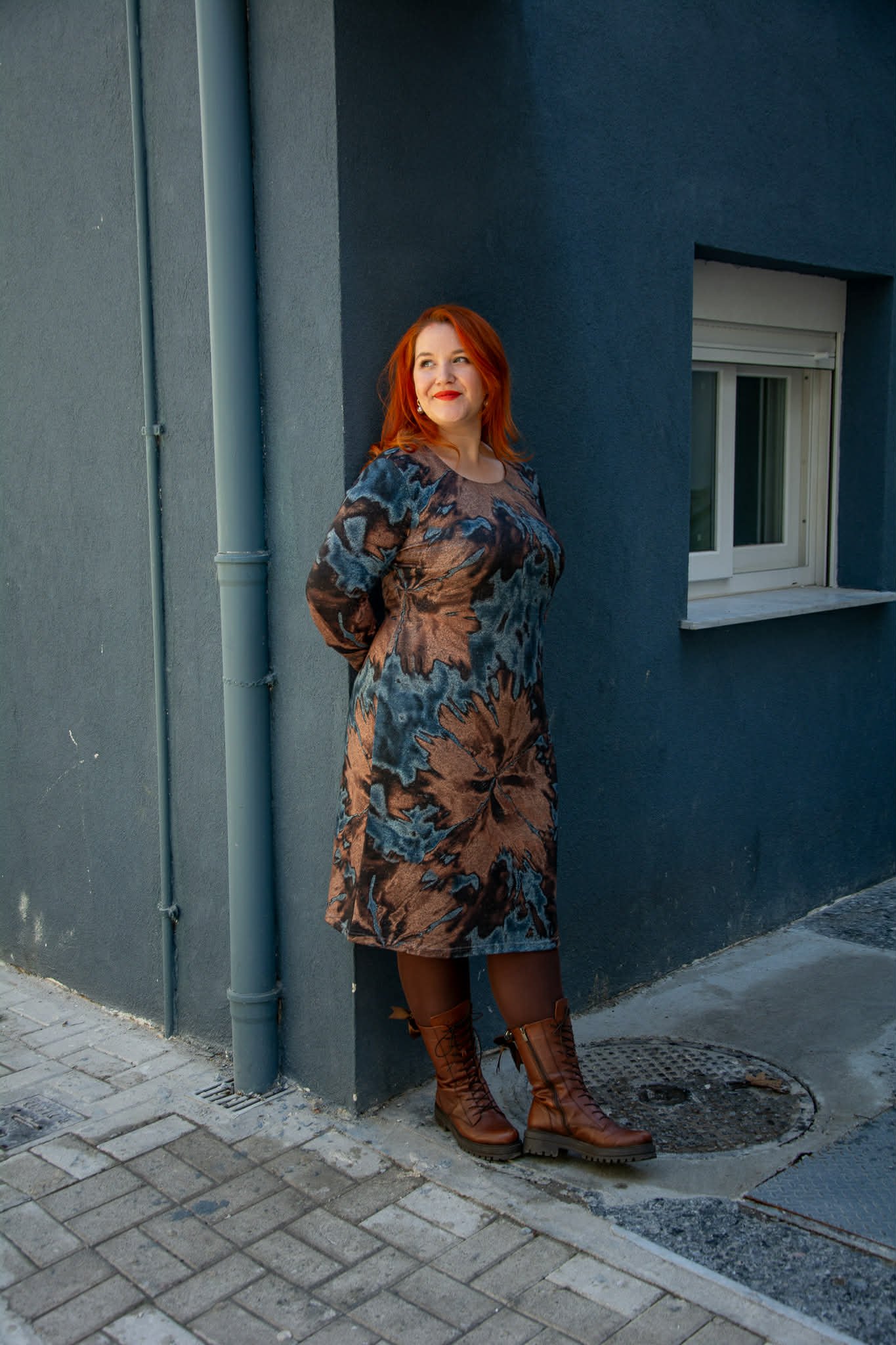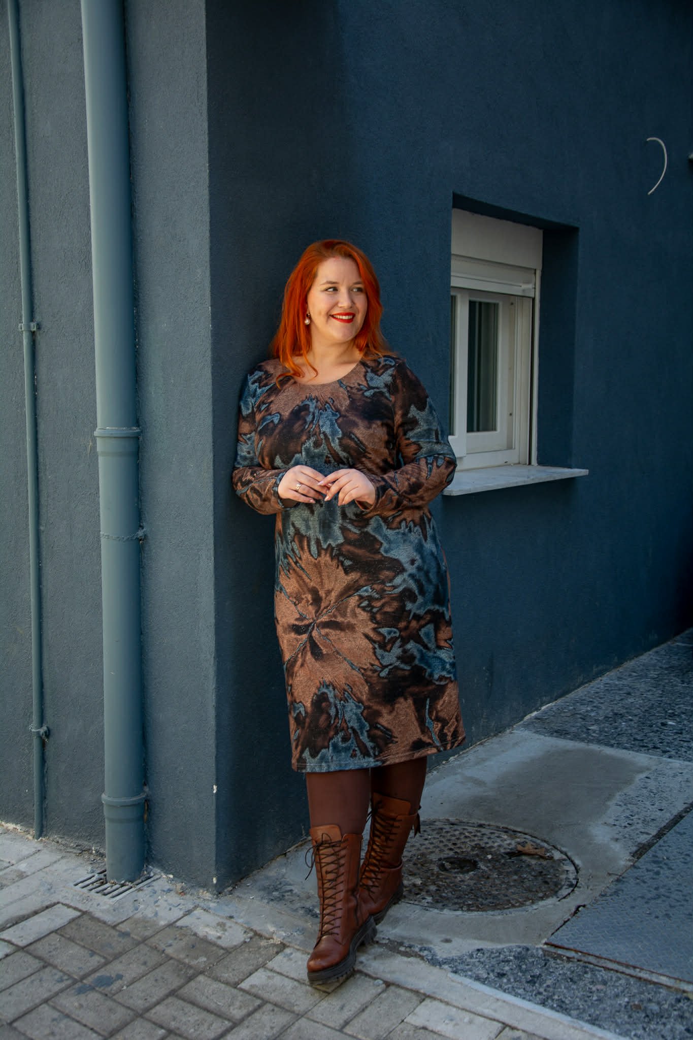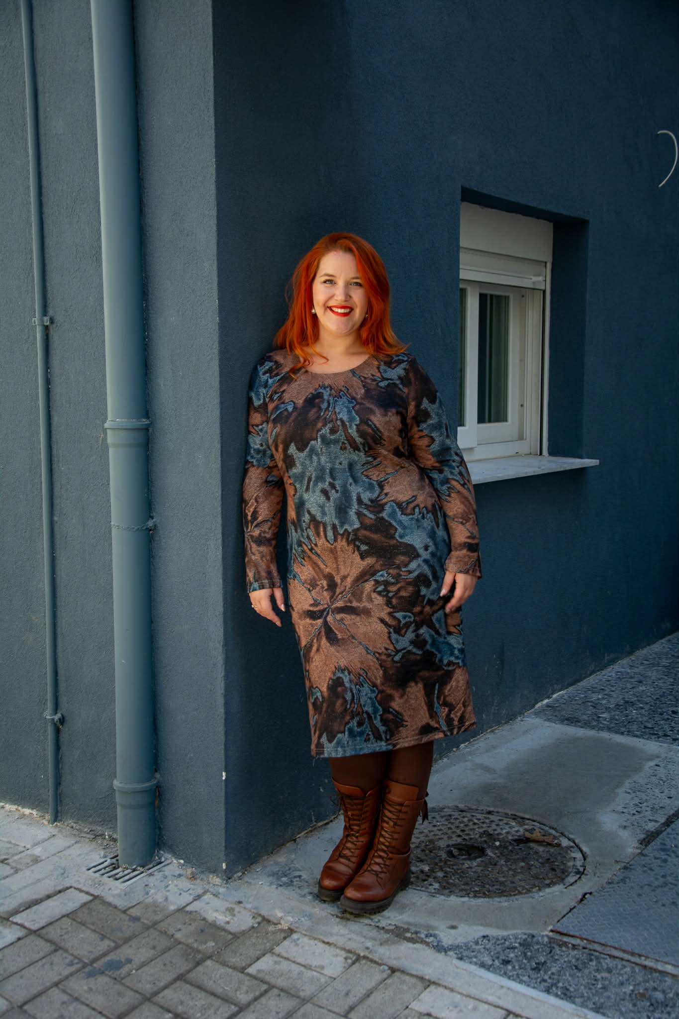 Φόρεμα, σε μεγάλα μεγέθη. Είναι μίντι, σε ίσια γραμμή και έχει στρογγυλεμένο ντεκολτέ. Είναι φοδραρισμένο.