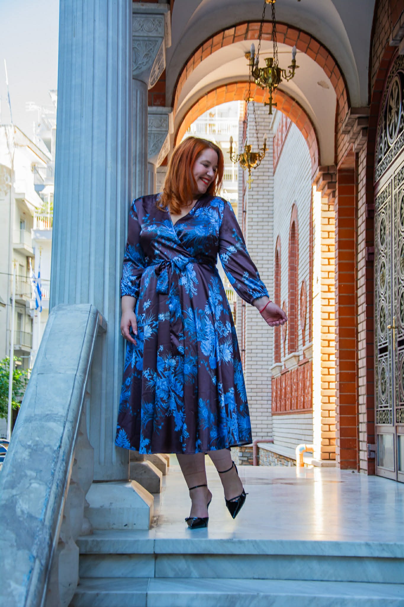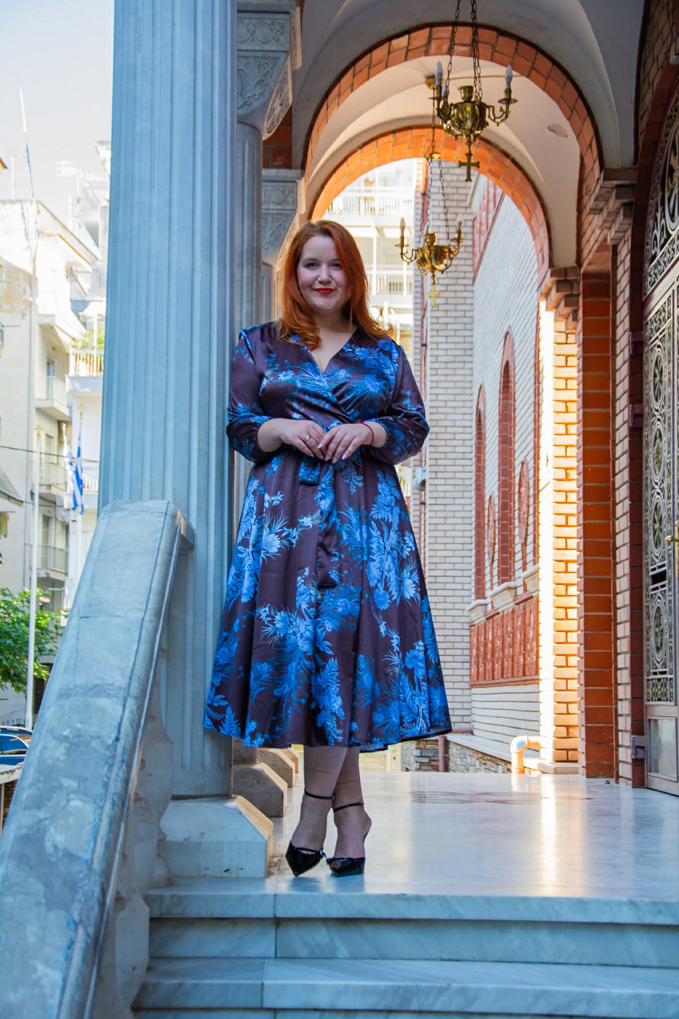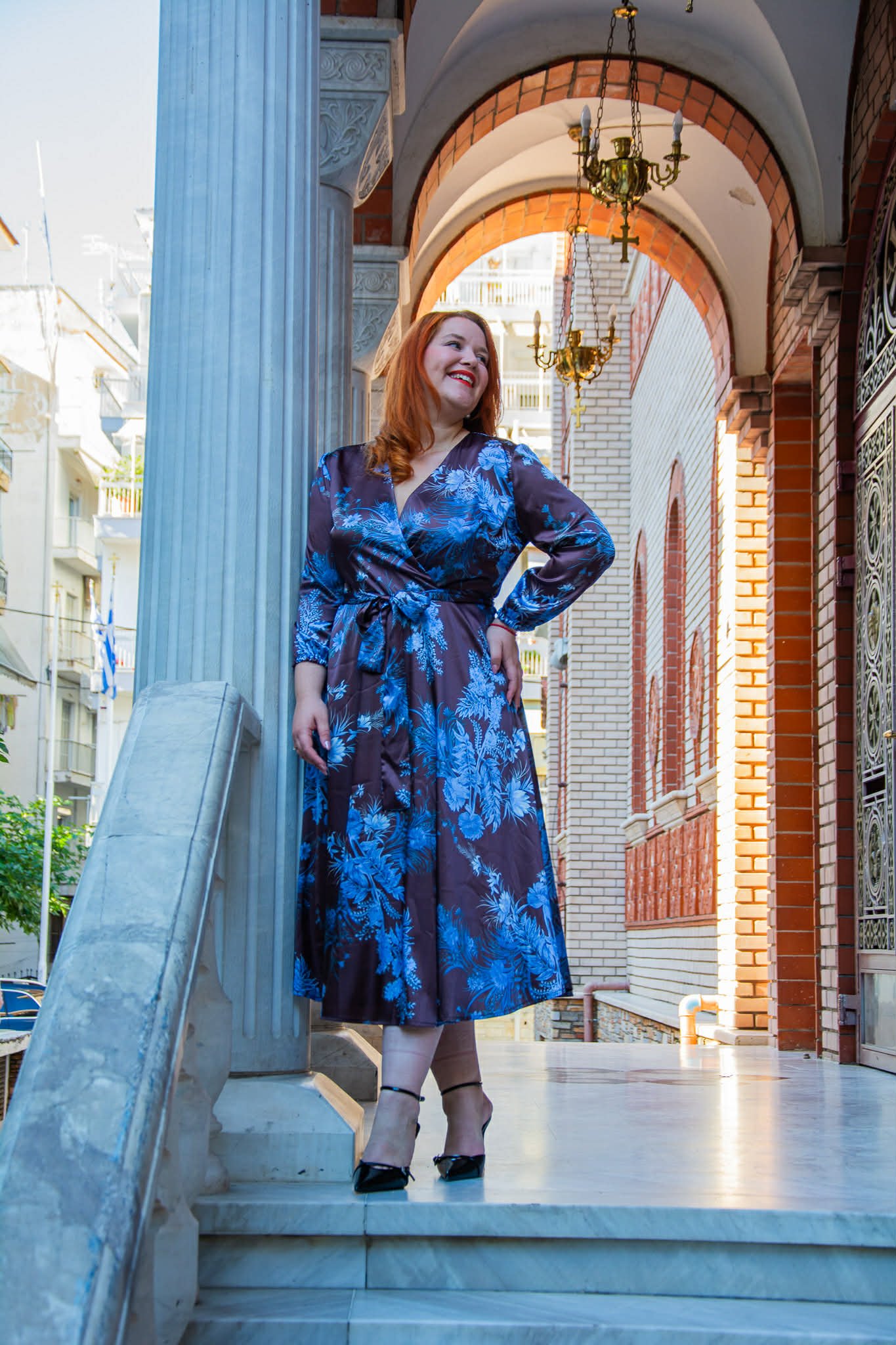 Φόρεμα, σε μεγάλα μεγέθη. Είναι μίντι, κρουαζέ, φοδραρισμένο και έχει λάστιχο στο τελείωμα του μανικιού. Διαθέτει ζώνη από το ίδιο ύφασμα.